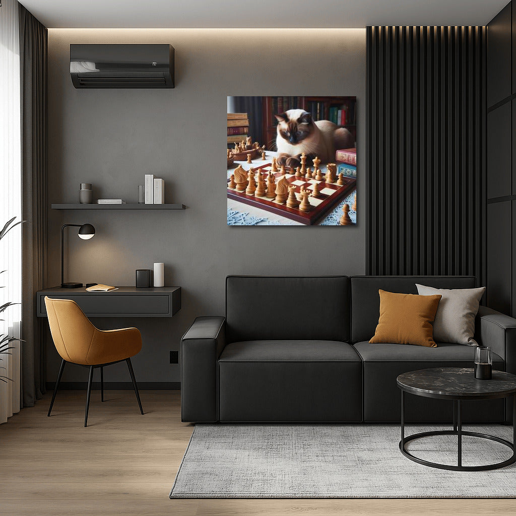Immerse yourself in this mesmerizing wall art: a Burmese cat playing chess, with the pieces coming to life on the board. See more from the collection: Animals Art