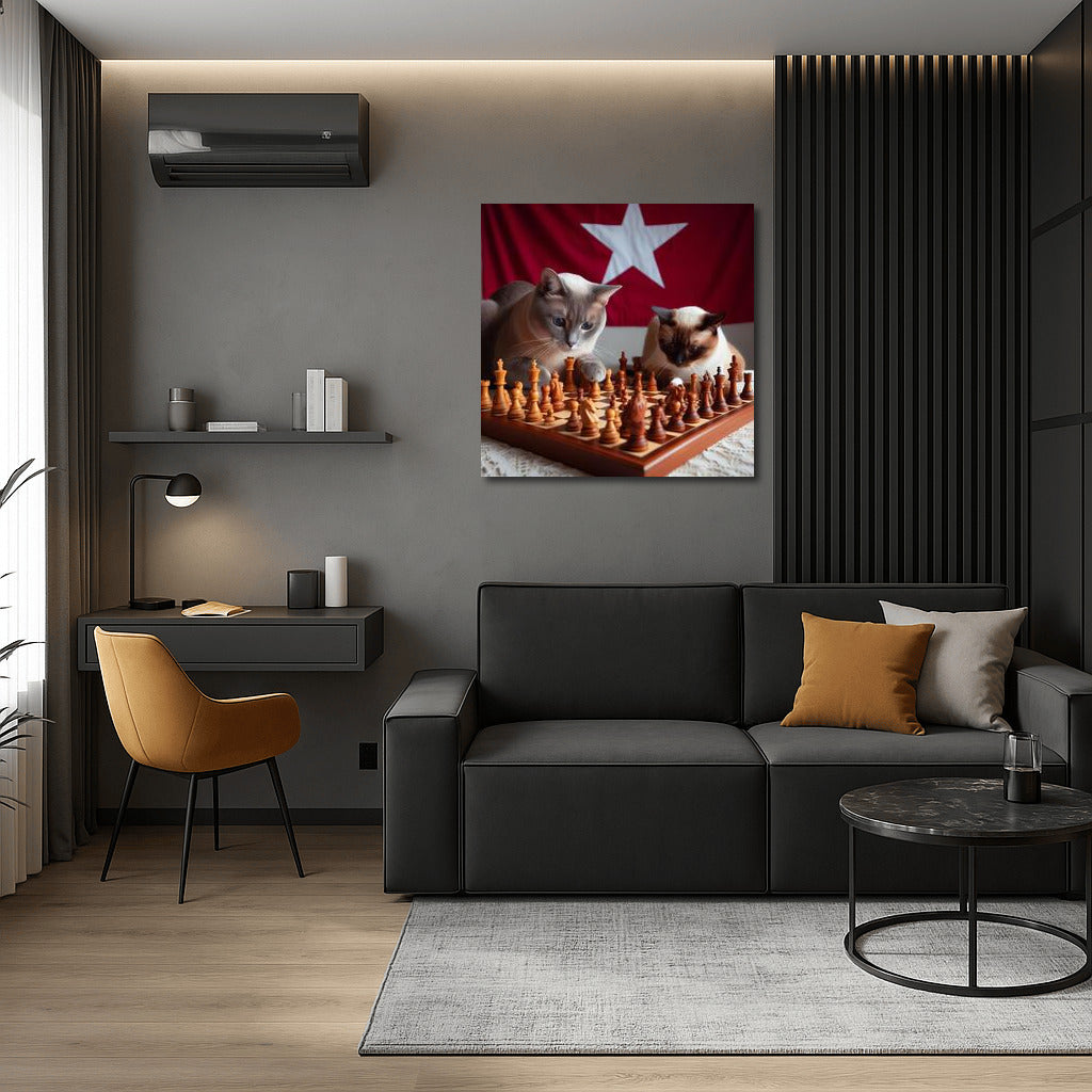 Chess battle comes to life: Burmese cat plays on the board. The perfect poster for wall art and gaming lovers! See more from the collection: Animals Art