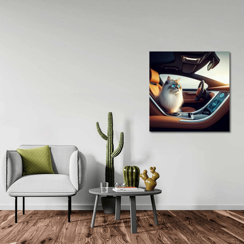 A furry Burmese driving a futuristic car is wall art for those who appreciate the style of the future and feline grace! See more from the collection: Animals Art