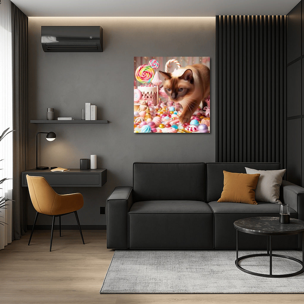 Chocolate World and Candy Parade! Birman cat explores colorful candy kingdom. Wall art for bright dreams! See more from the collection: Animals Art