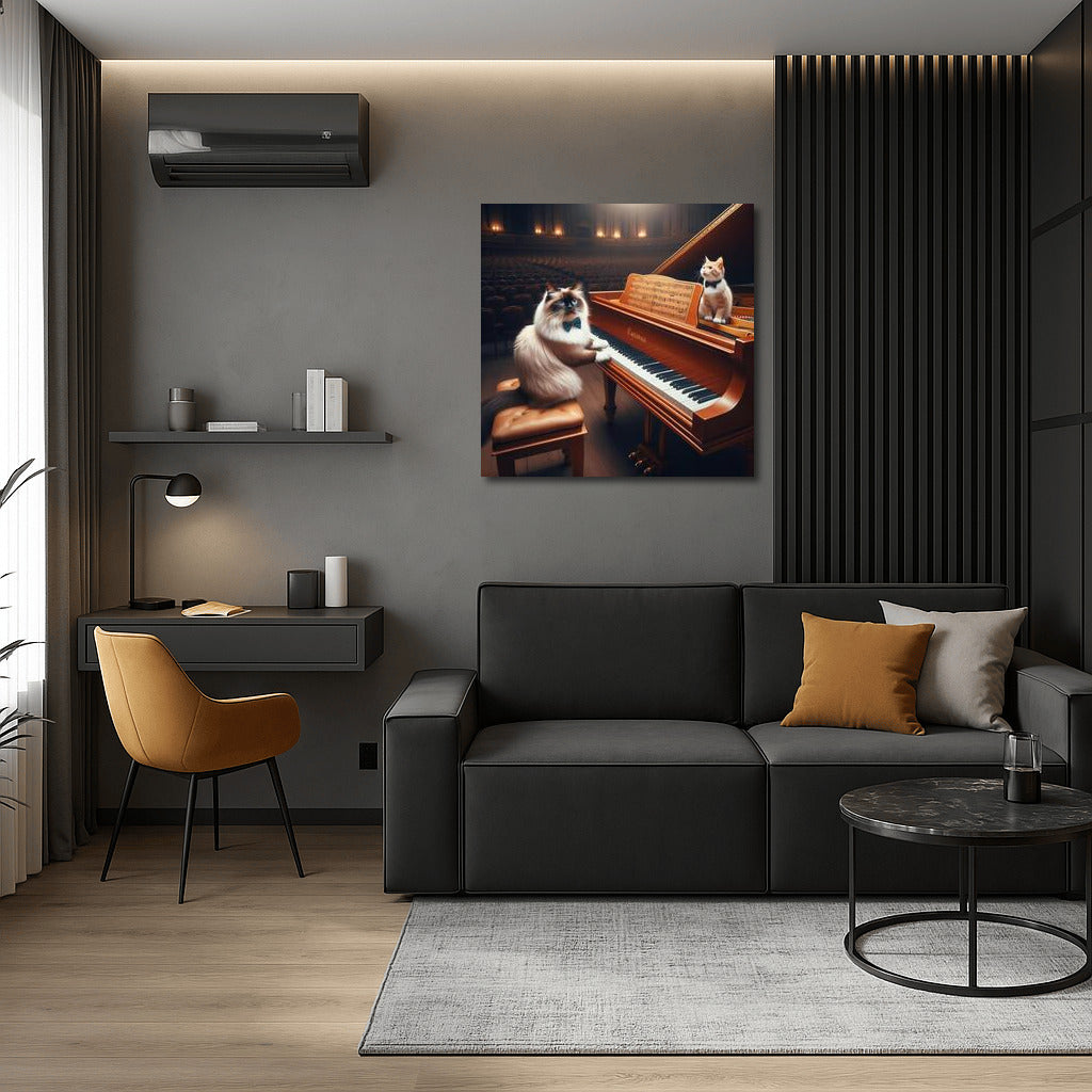 An elegant Burmese cat performs a symphony on the piano in the hall, turning the wall art into true magic. See more from the collection: Animals Art