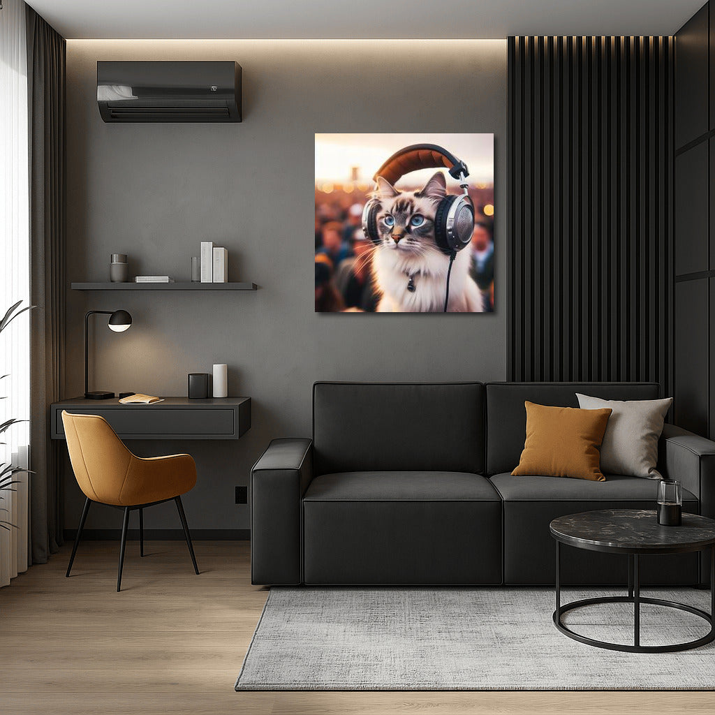 Burmese Cat Wears Stylish Headphones at Music Festival Wall Art