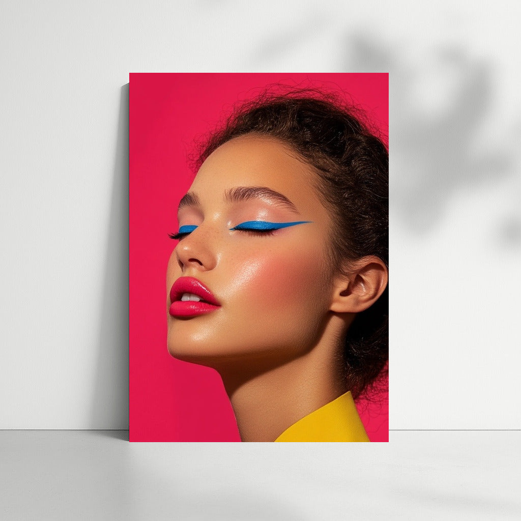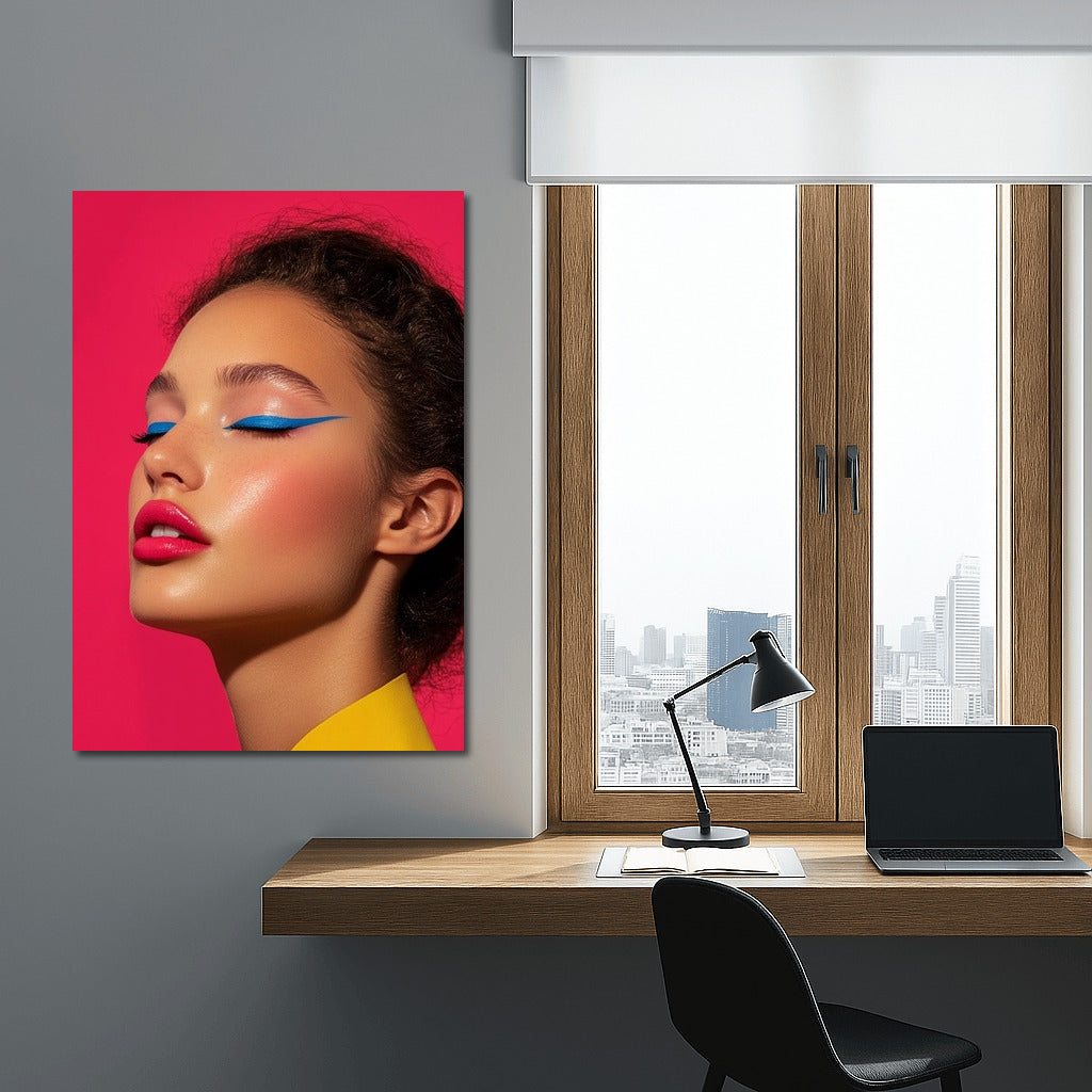 A bright poster painting: a portrait in rich colors. Emotions and style against the backdrop of a scarlet sunset. Wall art of the new era! See more from the collection: Wall Art with Women