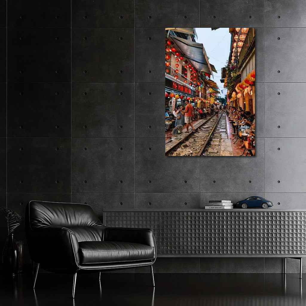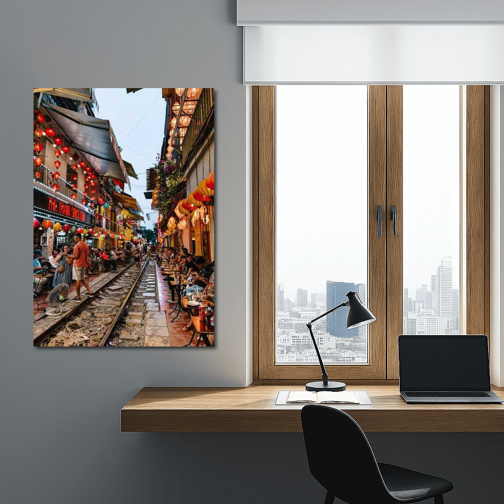 A lively Vietnamese street with lanterns and cafes. Immerse yourself in the atmosphere of Vietnam with this bright wall poster! See more from the collection: Country Art