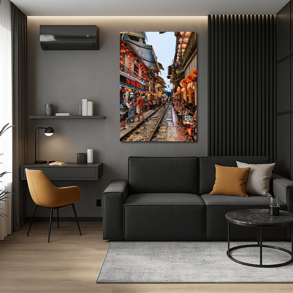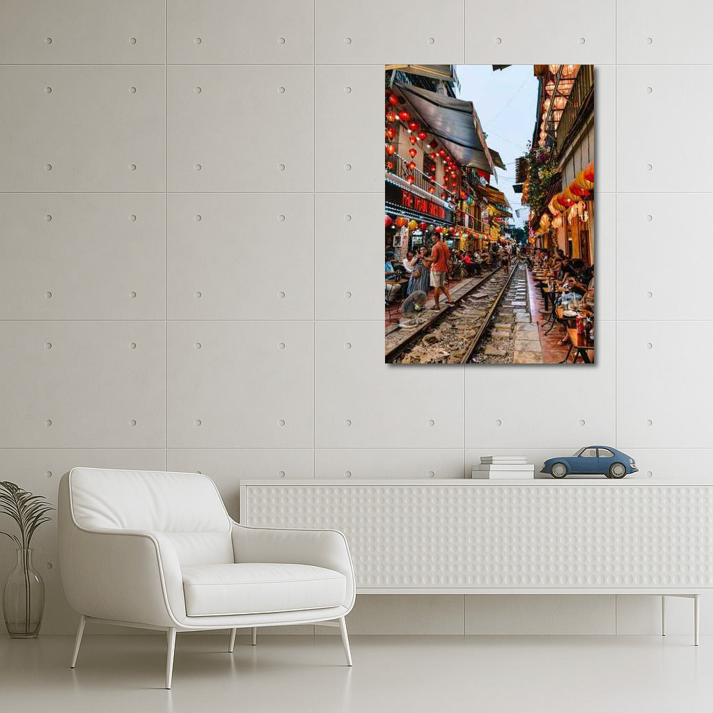 Busy Street of Vietnam: Lanterns and Cafes Wall Art