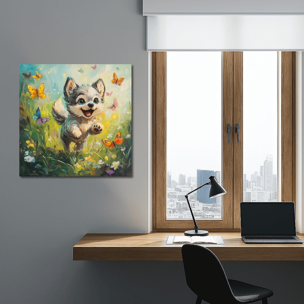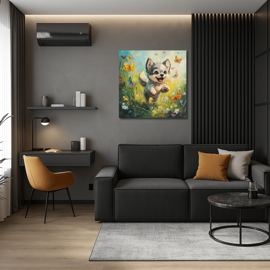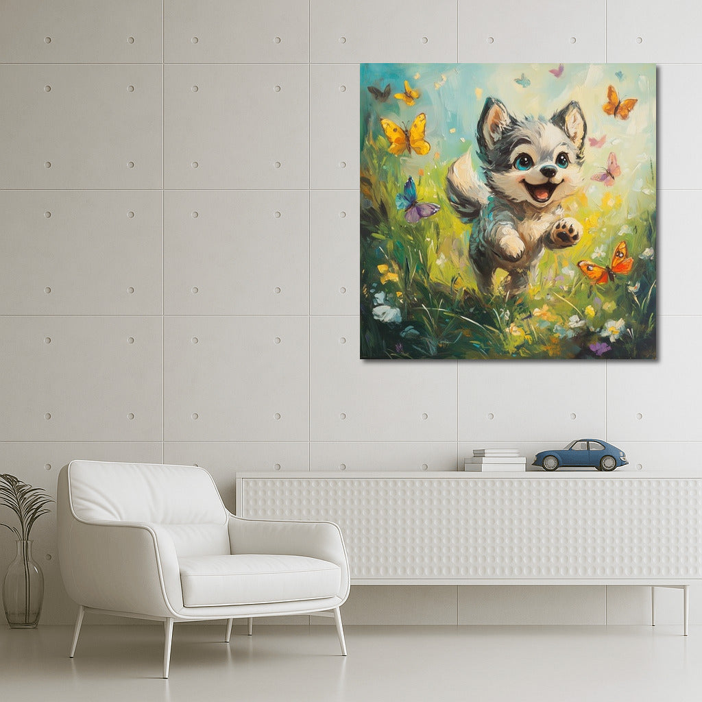 The fluffy bundle of joy in this painting brings life to your interior! This playful puppy and butterflies poster is the perfect wall art. See more from the collection: Cartoon Art