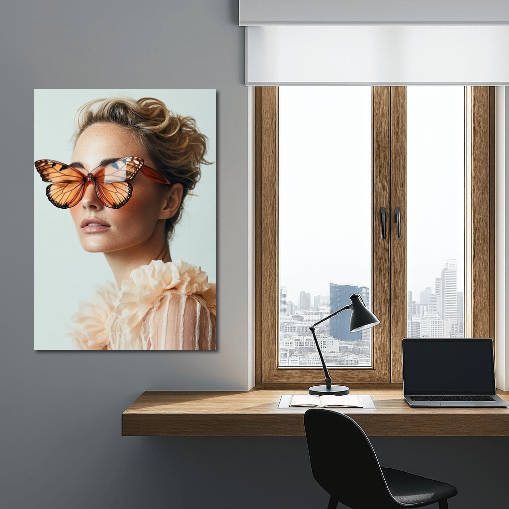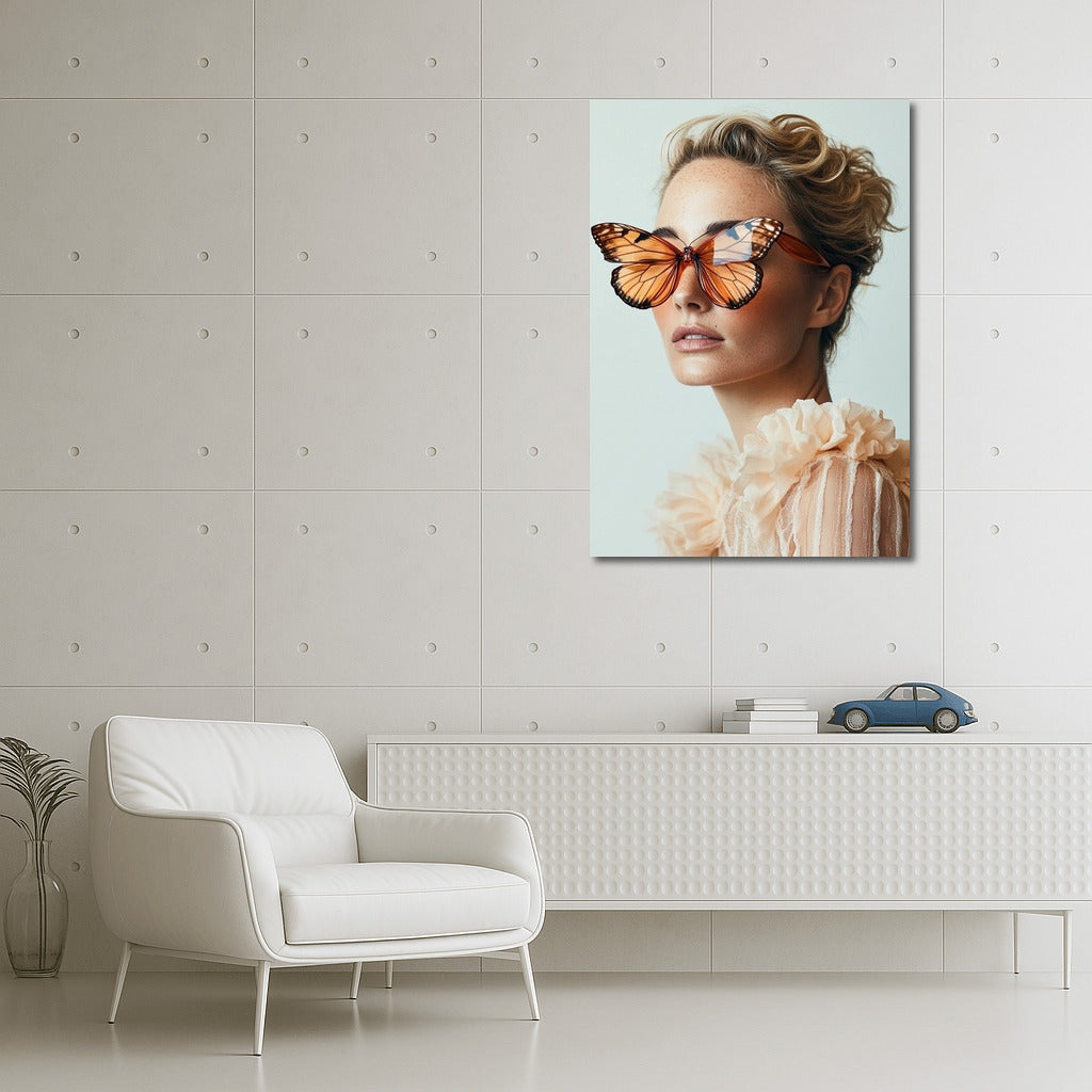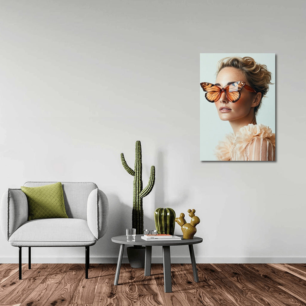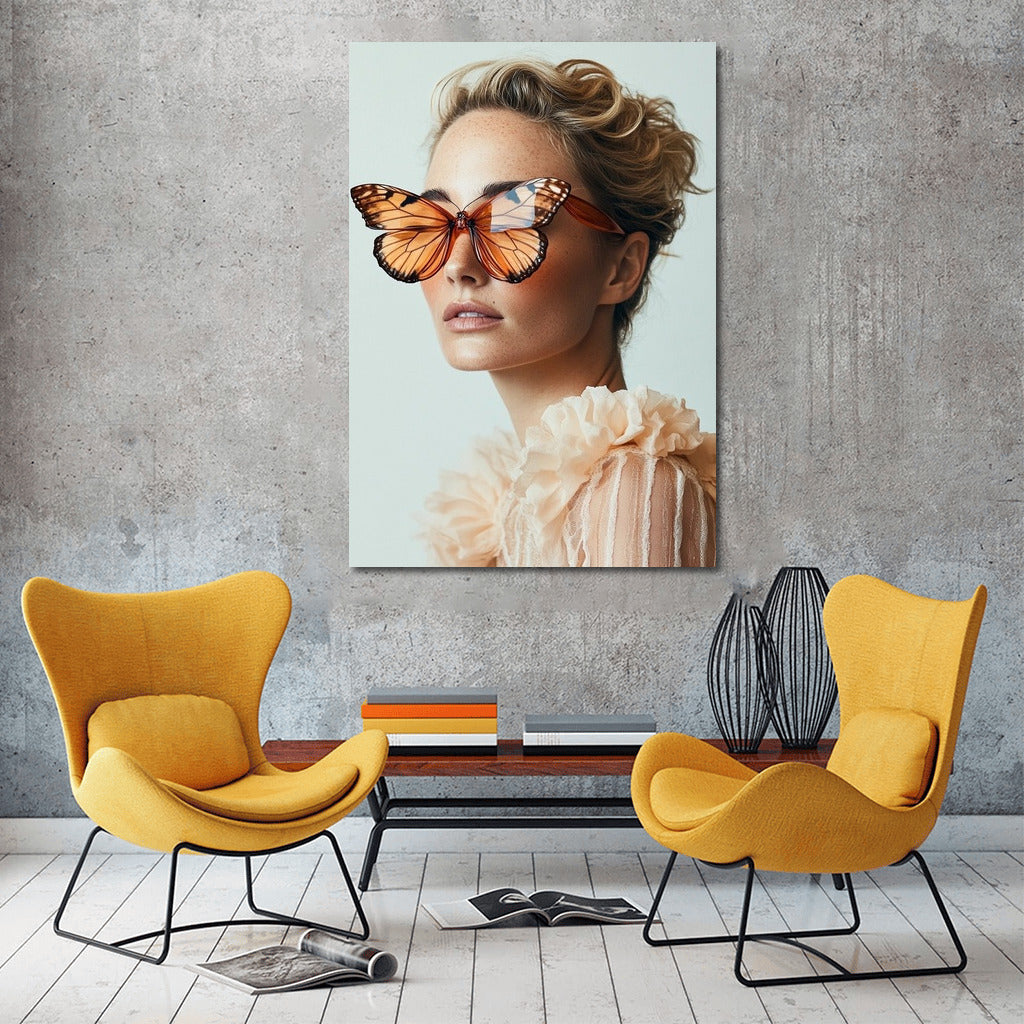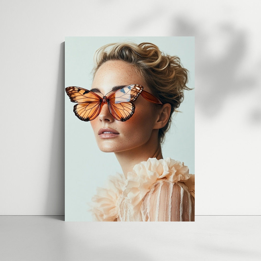 Unusual poster: girl with butterfly glasses. Unique wall art that adds lightness and grace to your space. See more from the collection: Wall Art with Women