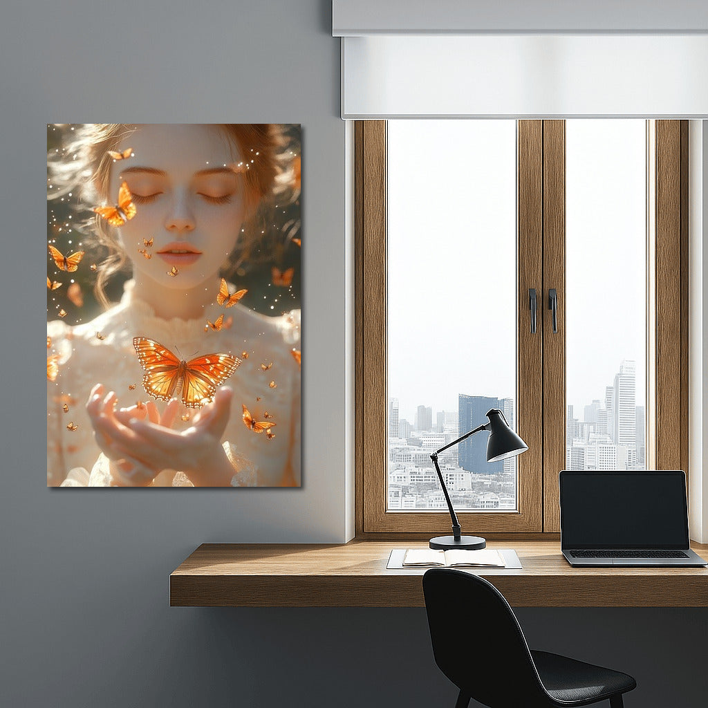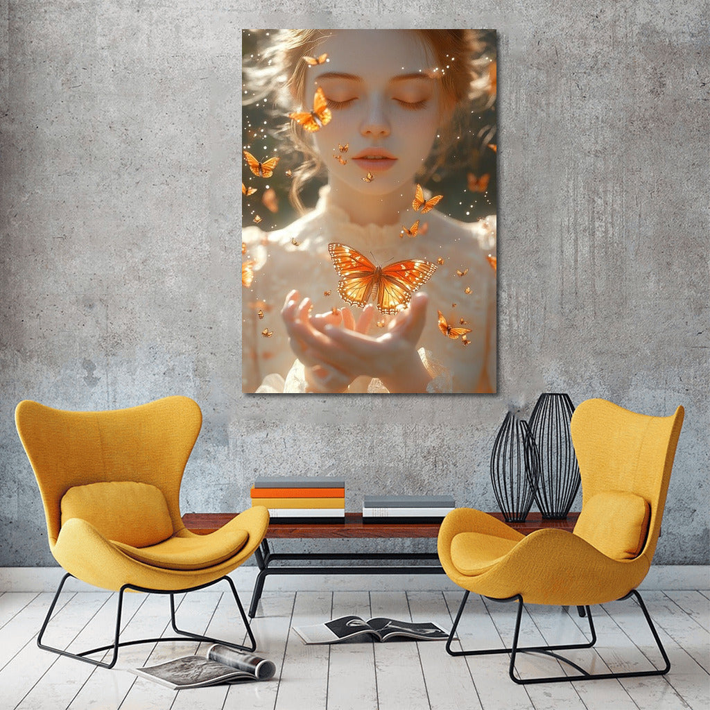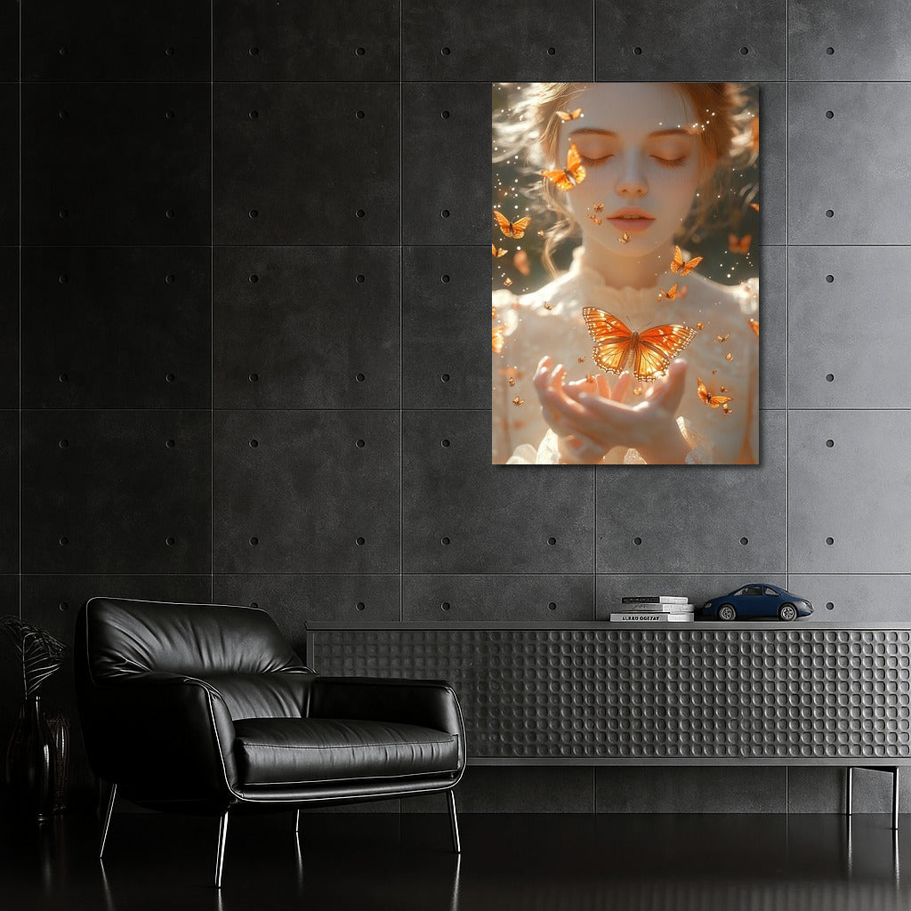 Ethereal painting of a girl surrounded by butterflies creates an atmosphere of magic. Wall art that brings peace and beauty. See more from the collection: Wall Art with Women