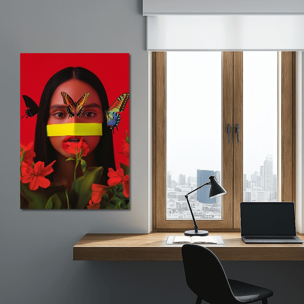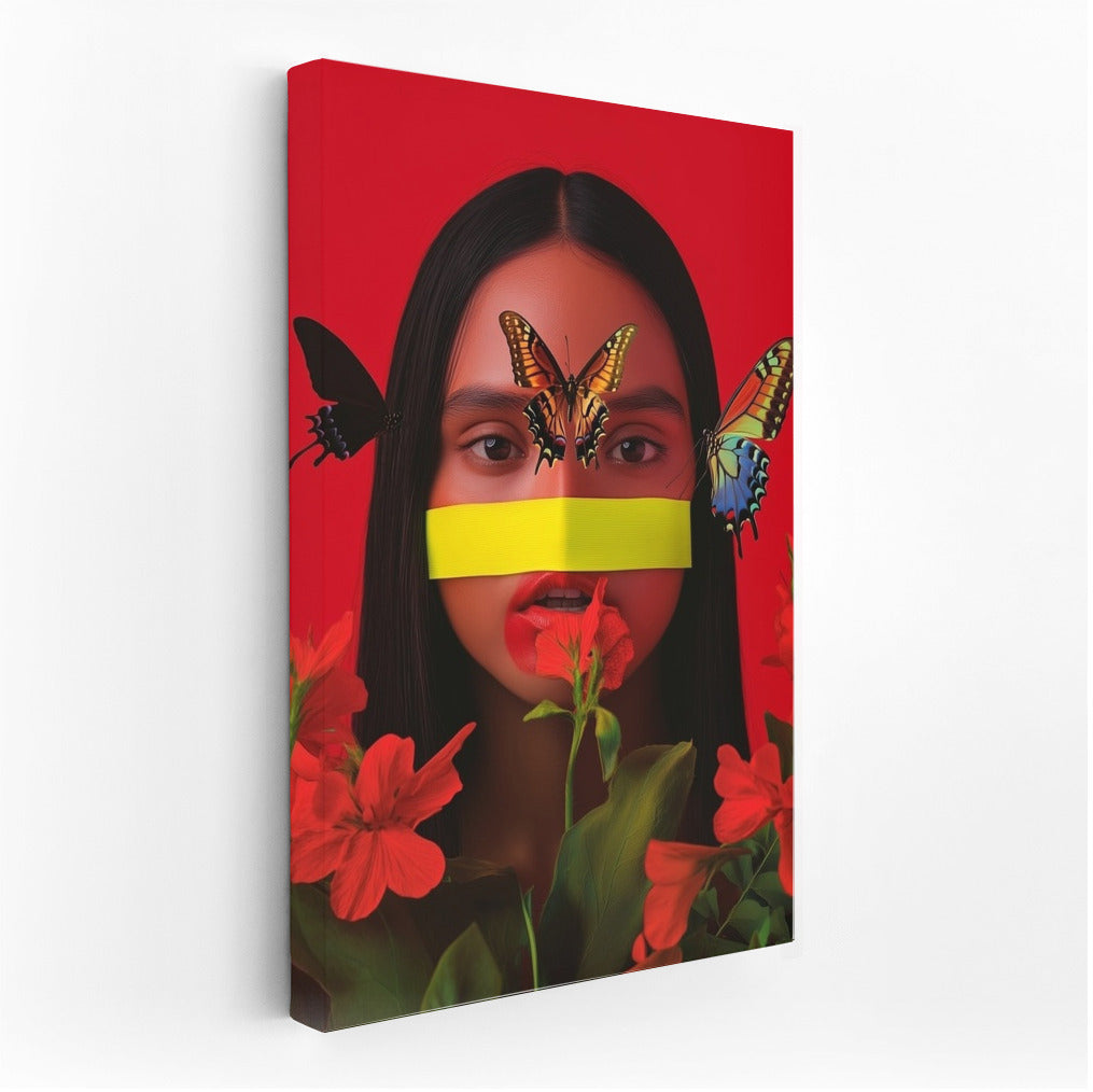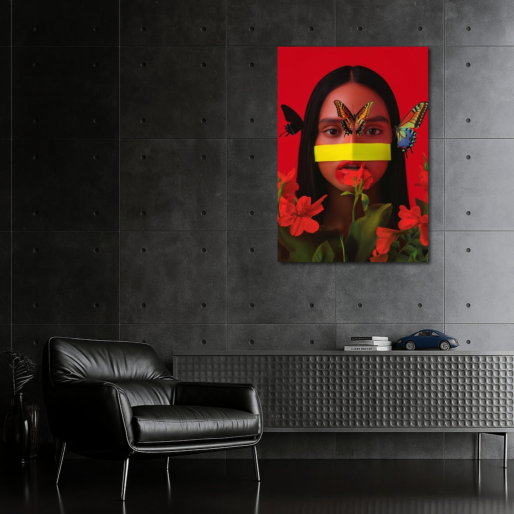 A rich painting with a vivid play of contrasts: a figure wrapped in butterflies against a background of red flowers. Art for inspiration! See more from the collection: Mixed Wall Art