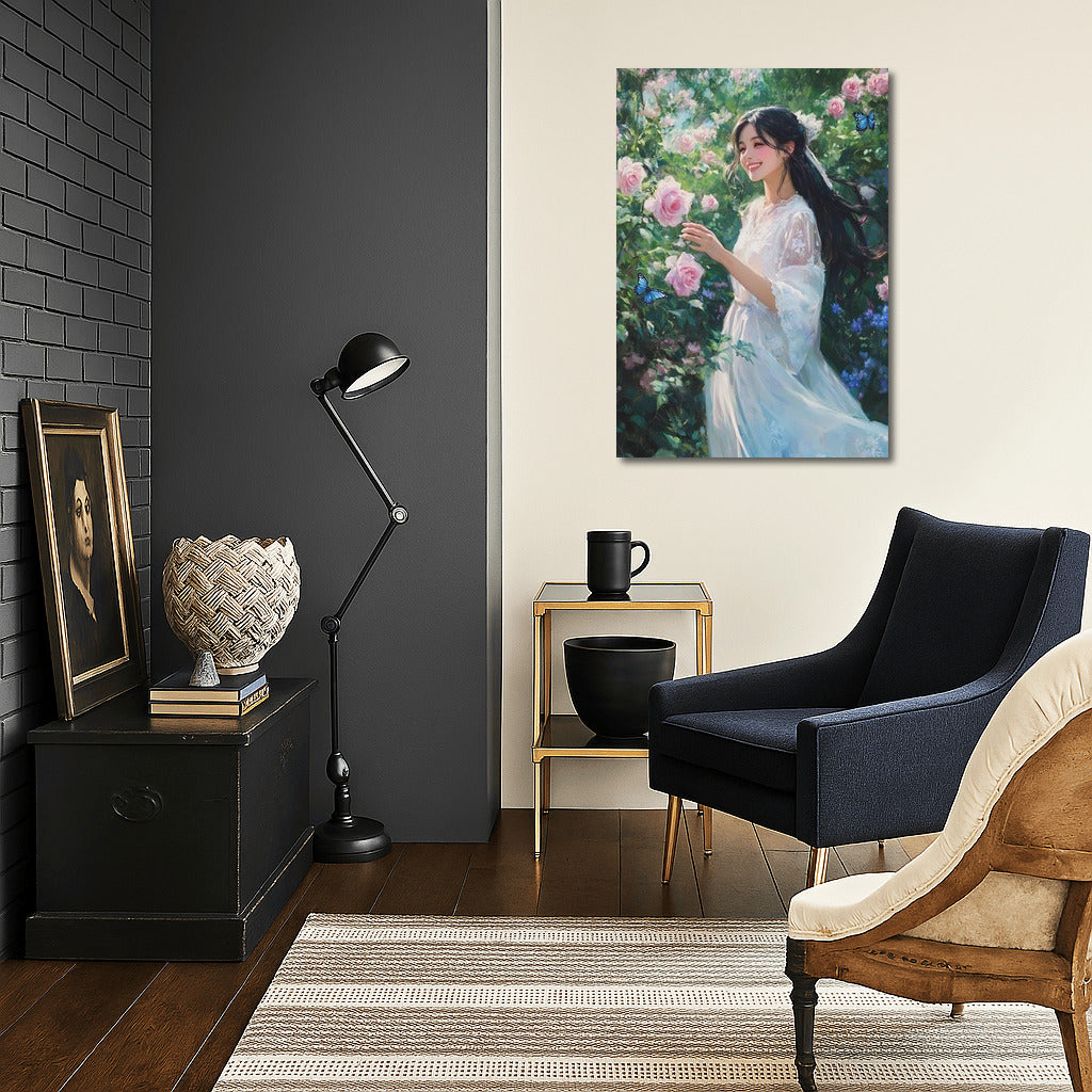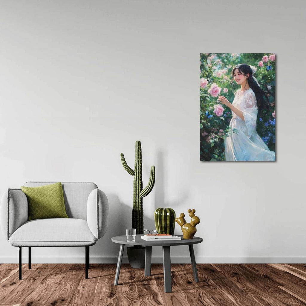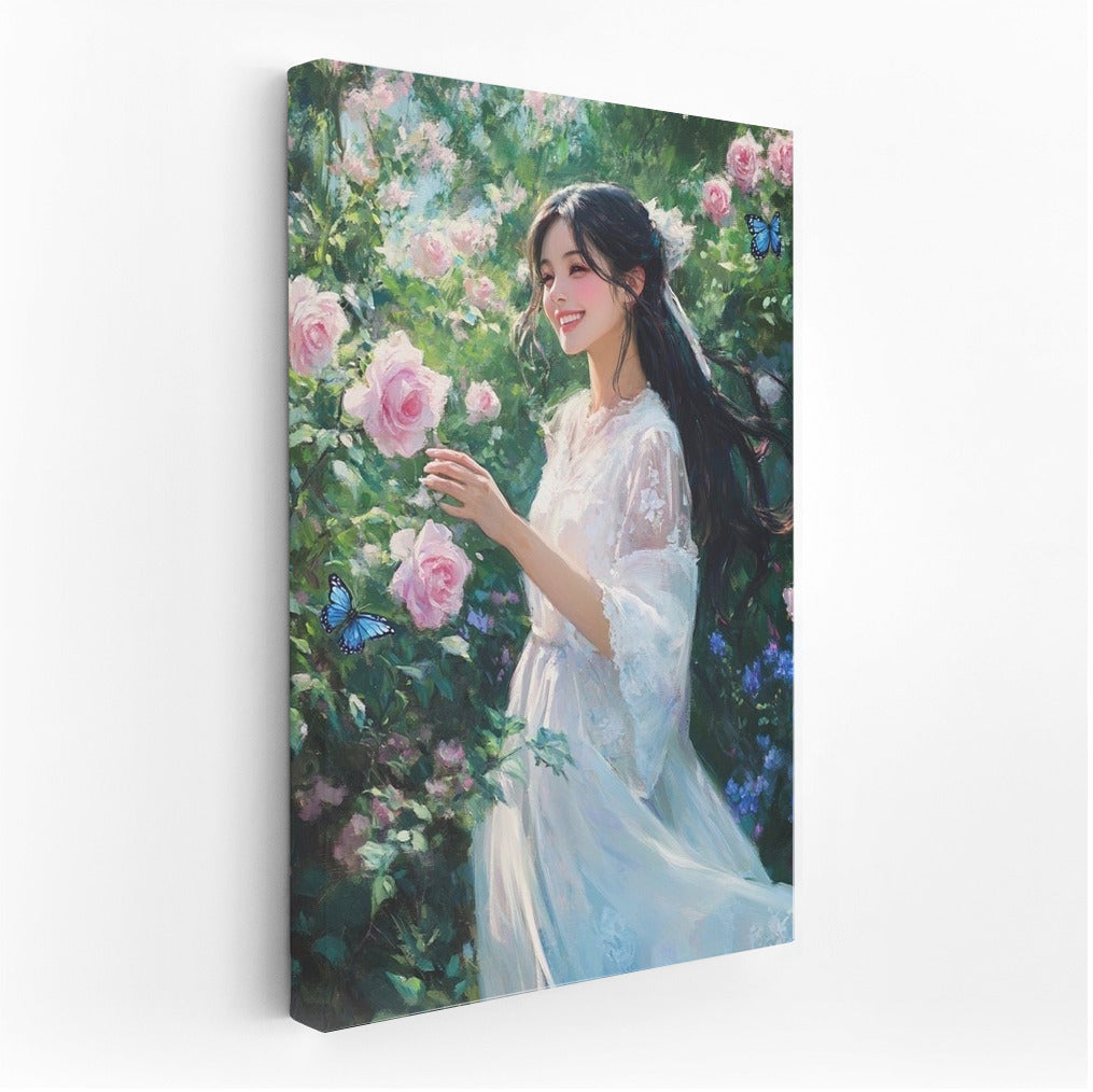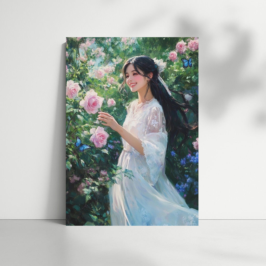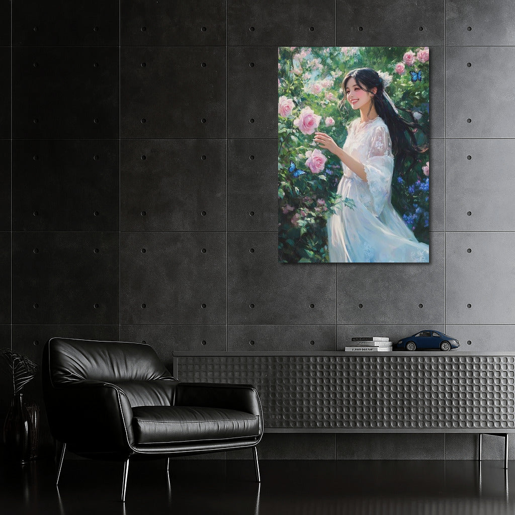 Open the door to a dream world with this painting: a delicate figure among flowers and fluttering butterflies. A poster that inspires. See more from the collection: Mixed Wall Art