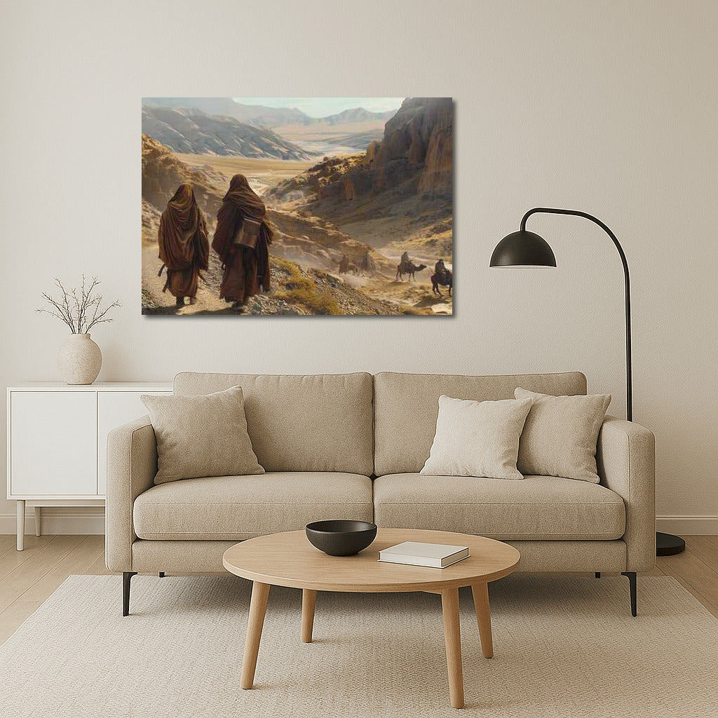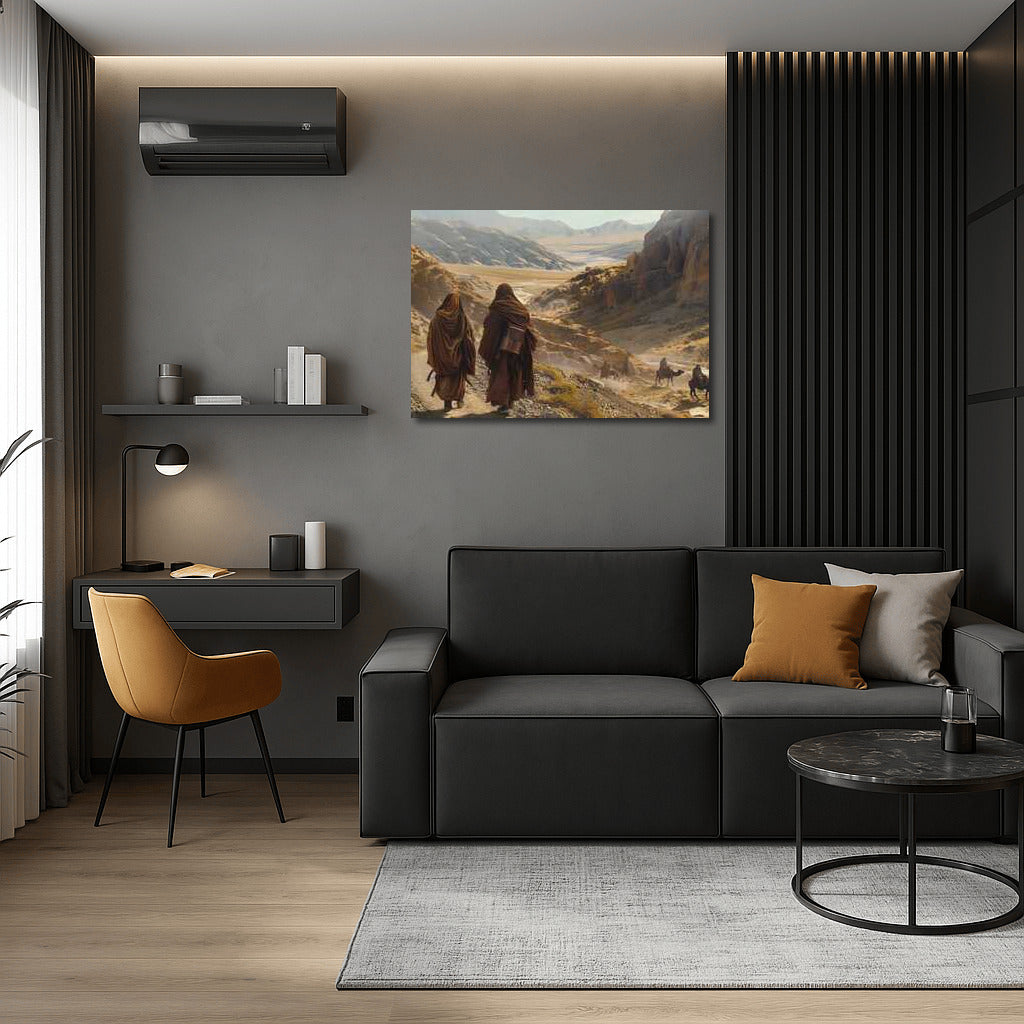 An ancient path through the centuries: a painting of Byzantine monks that brings the walls to life with the spirit of history and silent travel. See more from the collection: Religion Art