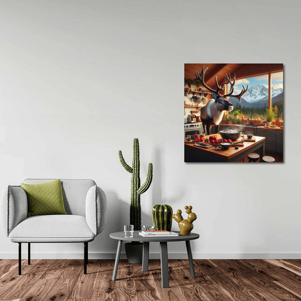 Poster of a stunning caribou cooking dinner in a kitchen with mountains in the background. Wall art for nature lovers and humor lovers! See more from the collection: Animals Art