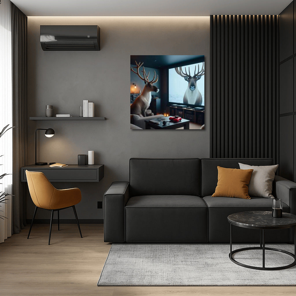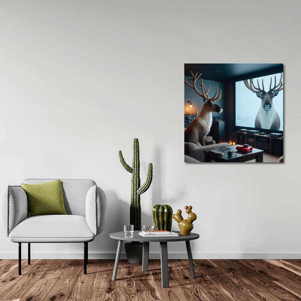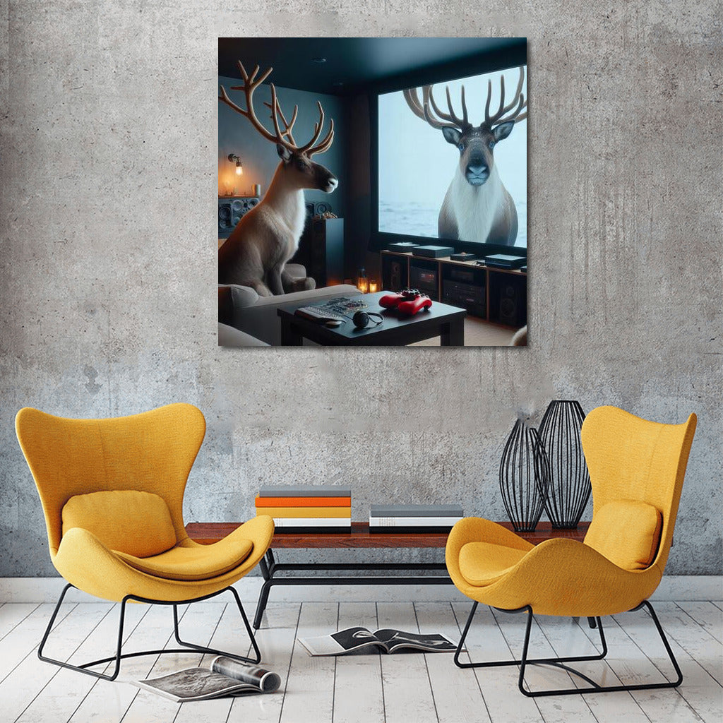 Creative mood poster: caribou enjoying video games in home theater. Liven up your walls with this art! See more from the collection: Animals Art