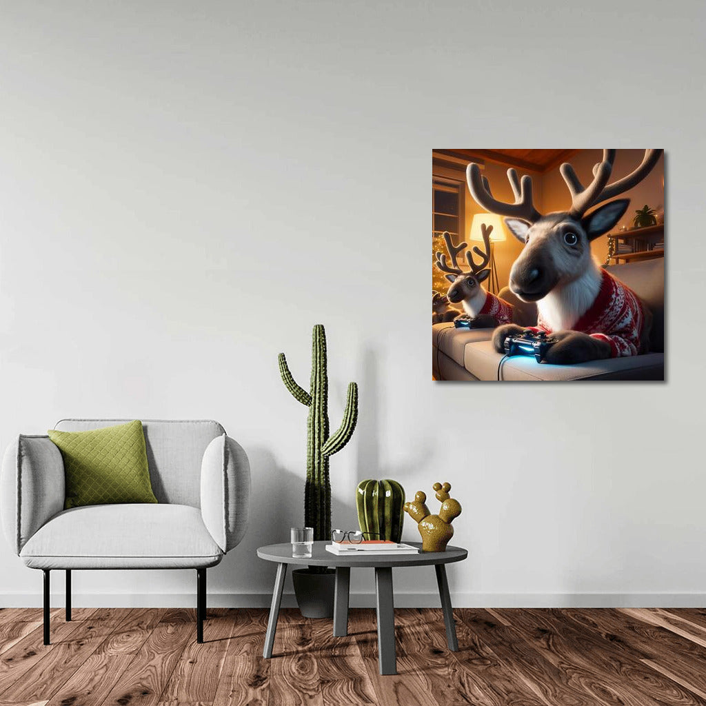 This poster features caribou playing video games in a cozy home theater. Perfect wall art for gamers! See more from the collection: Animals Art