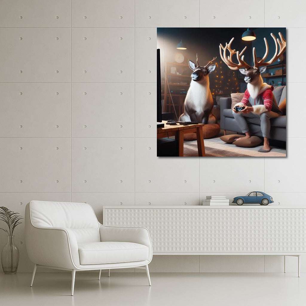 Immerse yourself in the magical world of wall art: caribou playing video games in a cozy home theater. See more from the collection: Animals Art