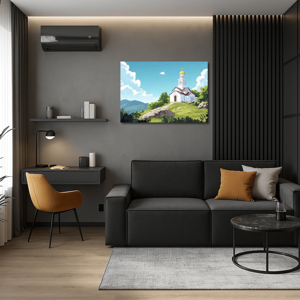 Bring your walls to life with this painting: Cartoon Church on a Hill Where Dreams Touch the Sky and Light Flows into the Soul. Wall Art. See more from the collection: Christianity / Jesus Art
