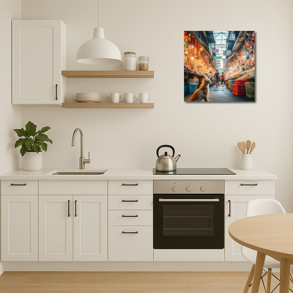 Immerse yourself in Bangkok with this poster: a cat in a vibrant market bazaar where every corner comes alive. Wall art full of life! See more from the collection: Animals Art