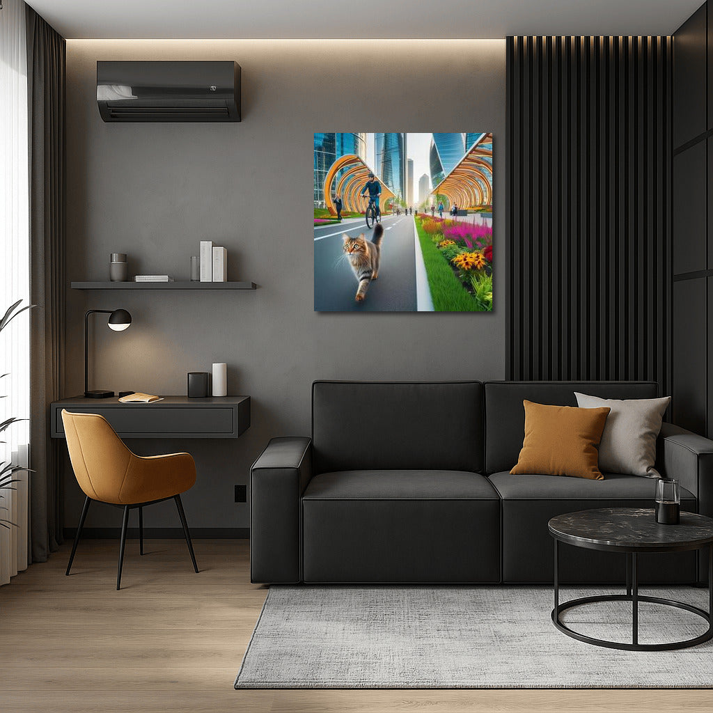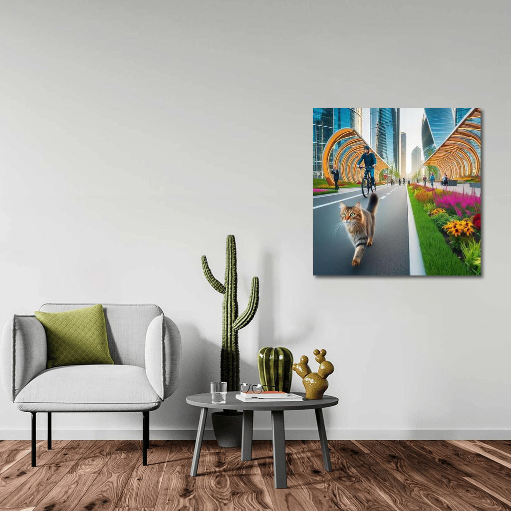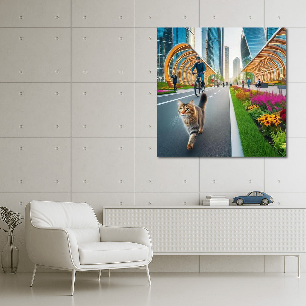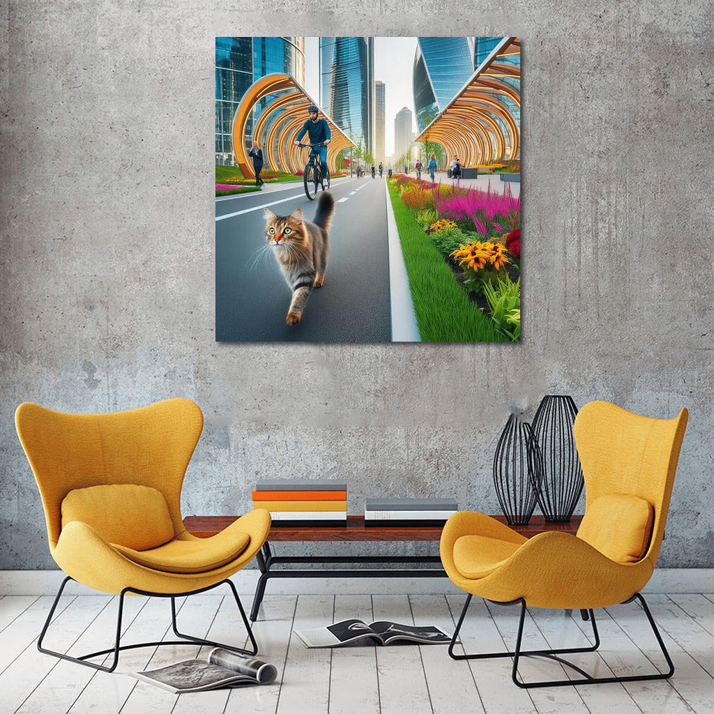 A cat runs among cyclists in the park of the future. Bright wall art for a modern interior! See more from the collection: Animals Art