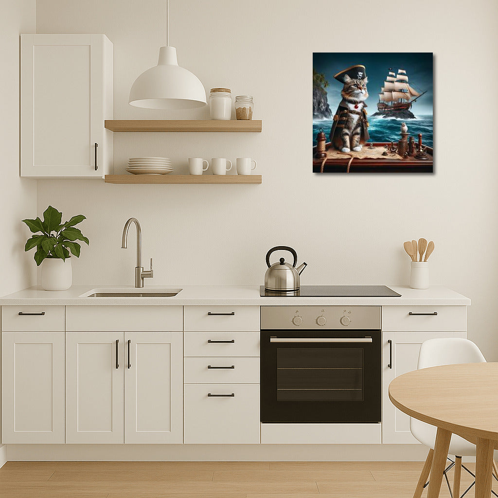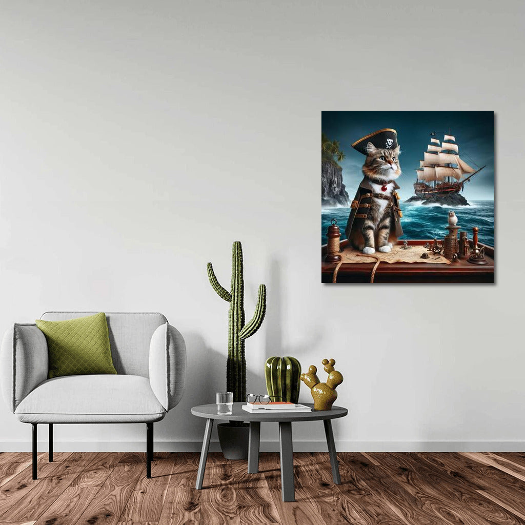 Poster for adventure lovers: a cat captain steers a pirate ship near a mysterious island with treasures. Wall art. See more from the collection: Animals Art
