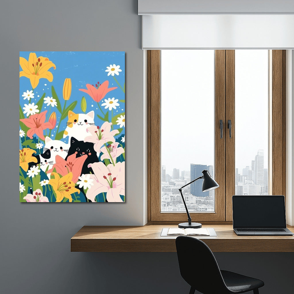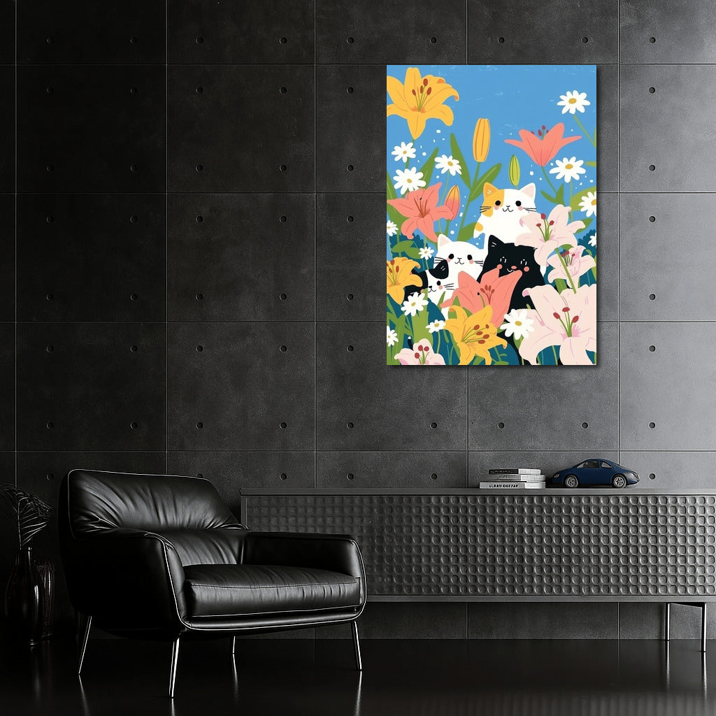 A colorful painting for cat lovers: four kittens frolic among bright flowers. The perfect poster for coziness and joy! ?? See more from the collection: Animals Art