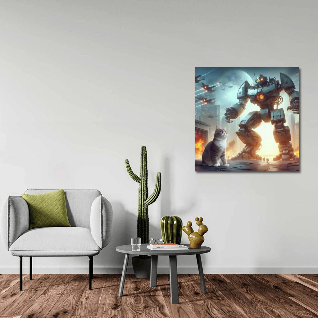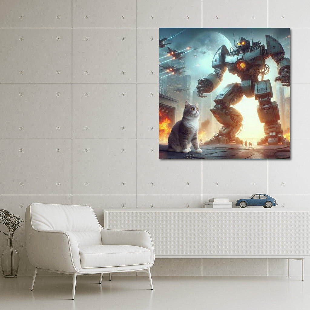 A cat controls a giant robot to protect the city from aliens. This poster is the perfect wall art for sci-fi fans! See more from the collection: Animals Art