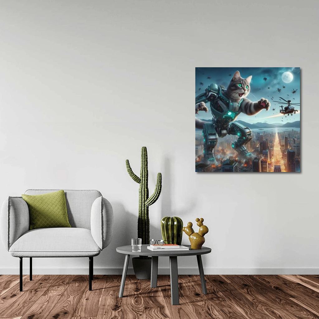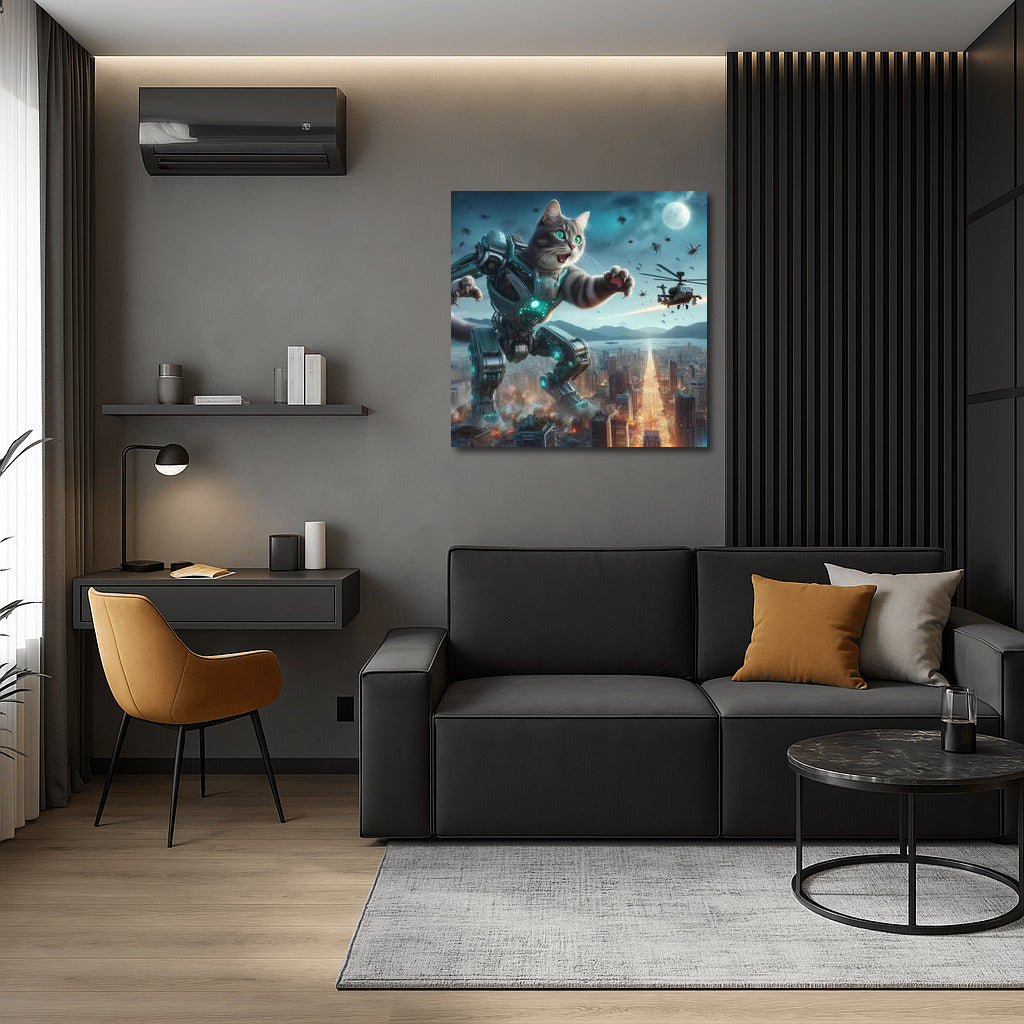 A cat controls a huge robot, protecting the city from aliens! Epic wall art for sci-fi lovers. See more from the collection: Animals Art