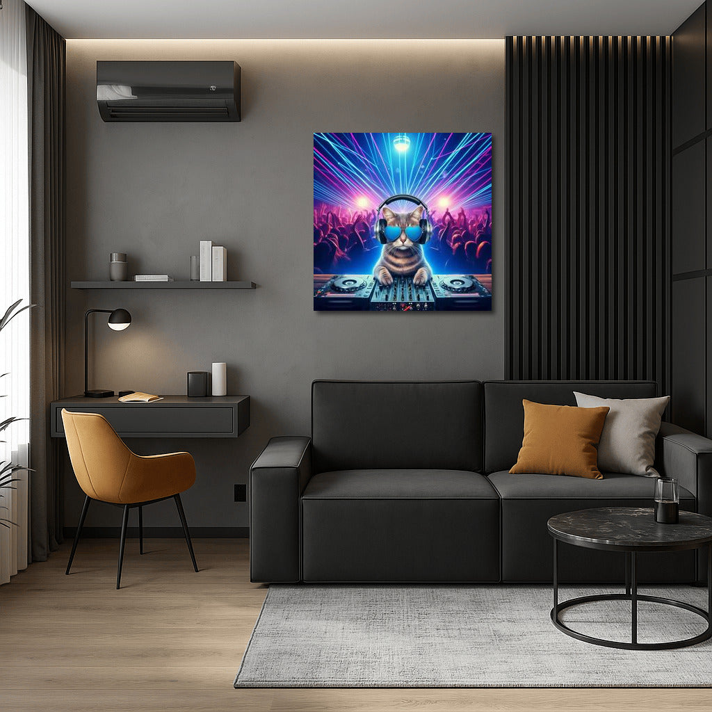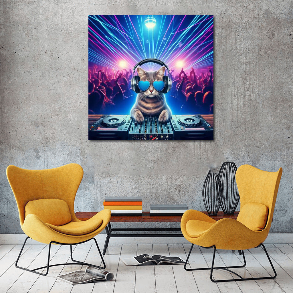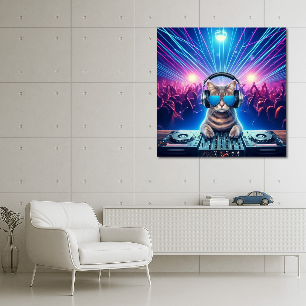 Cat DJ at Rave: Party in Glasses and Headphones Wall Art