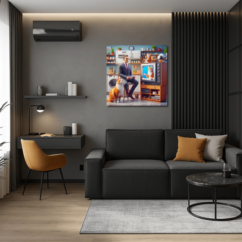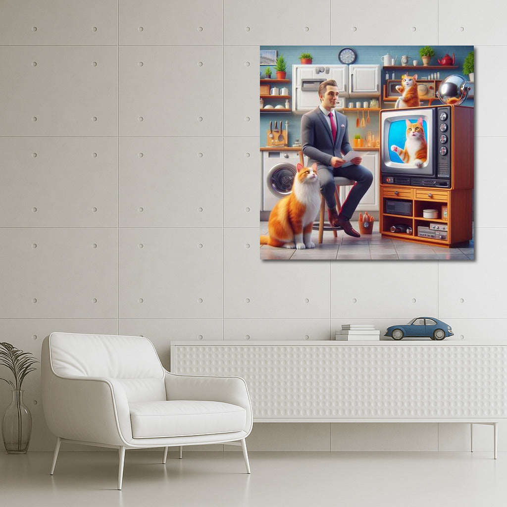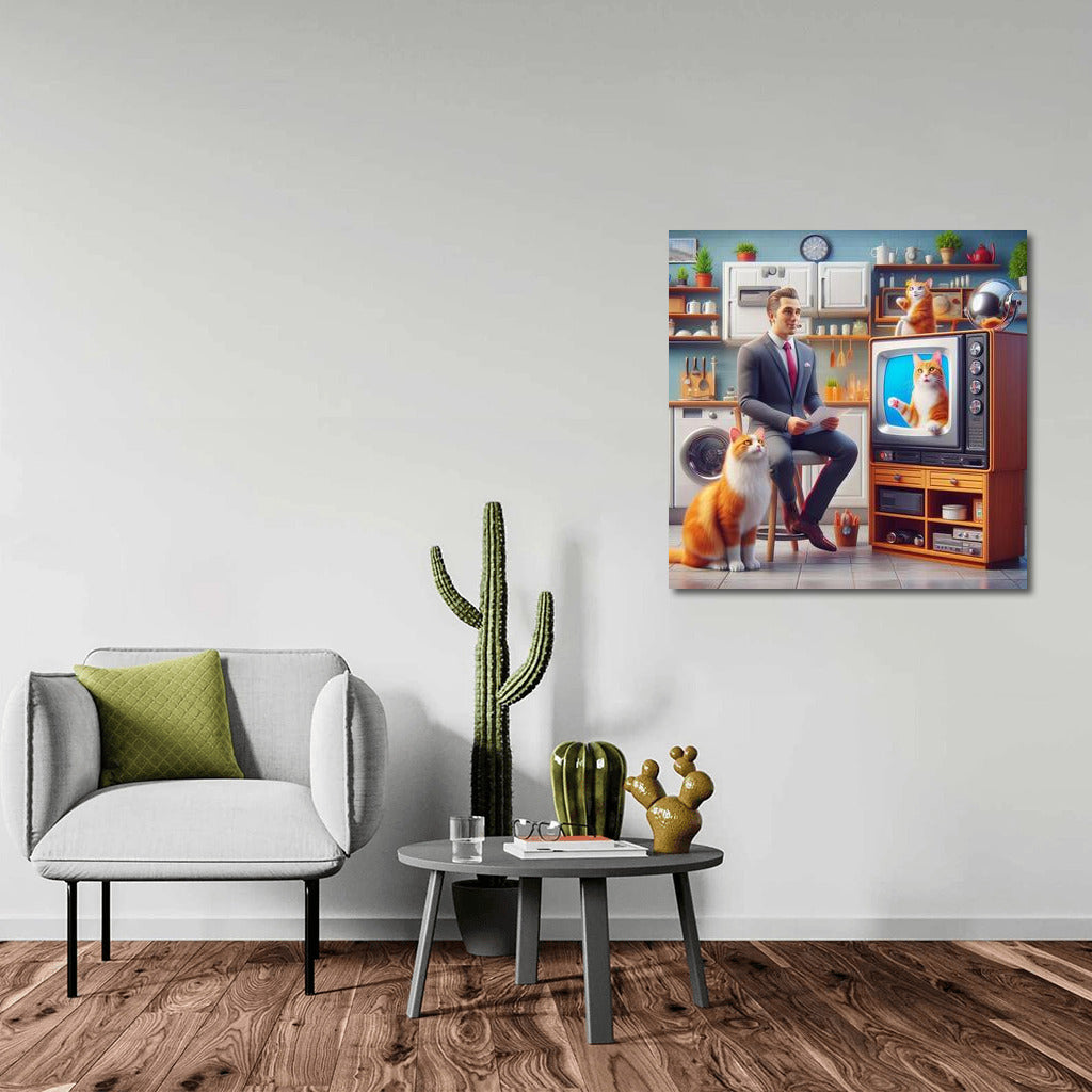 The cat hosts a TV show in a world where technology comes to life and tells stories. A unique poster for your interior! See more from the collection: Animals Art
