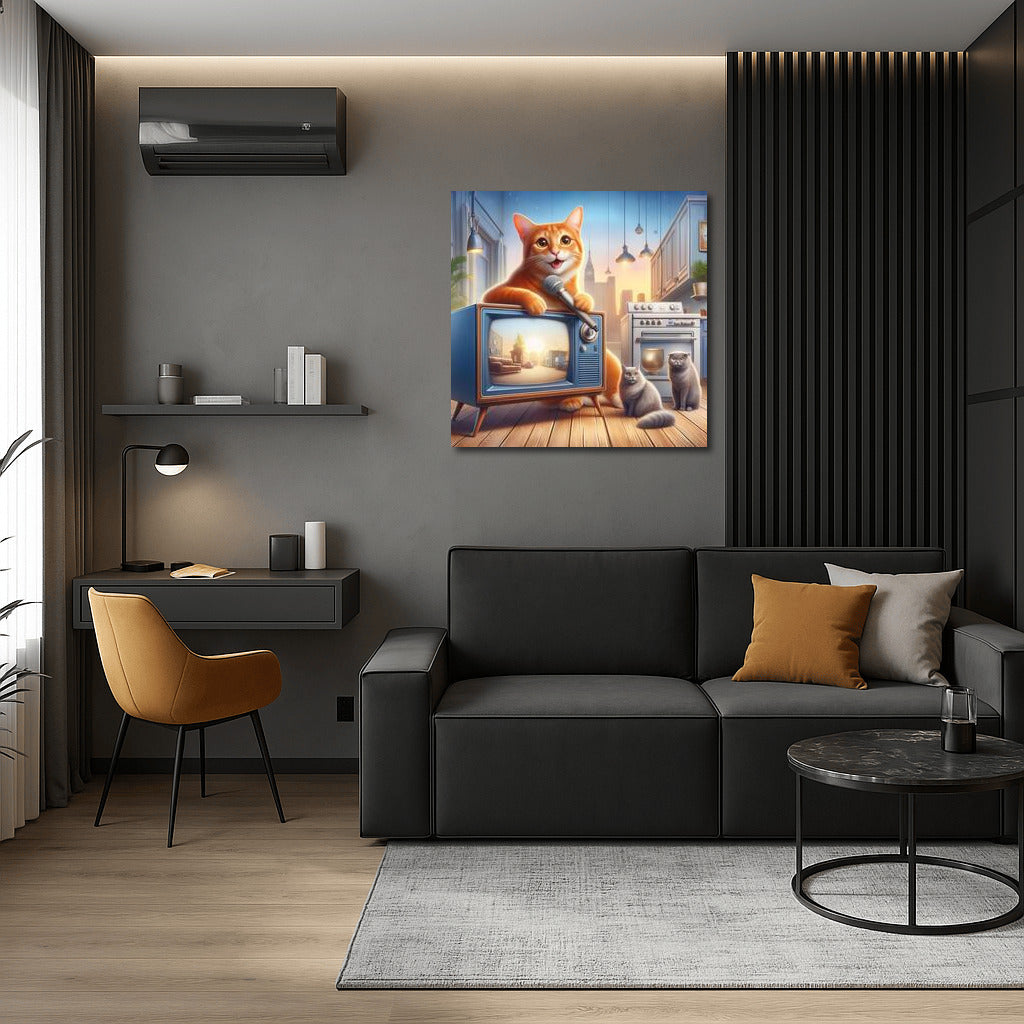 The cat hosts a show in a world where technology comes to life and tells its own stories. Unique wall art for your interior! See more from the collection: Animals Art