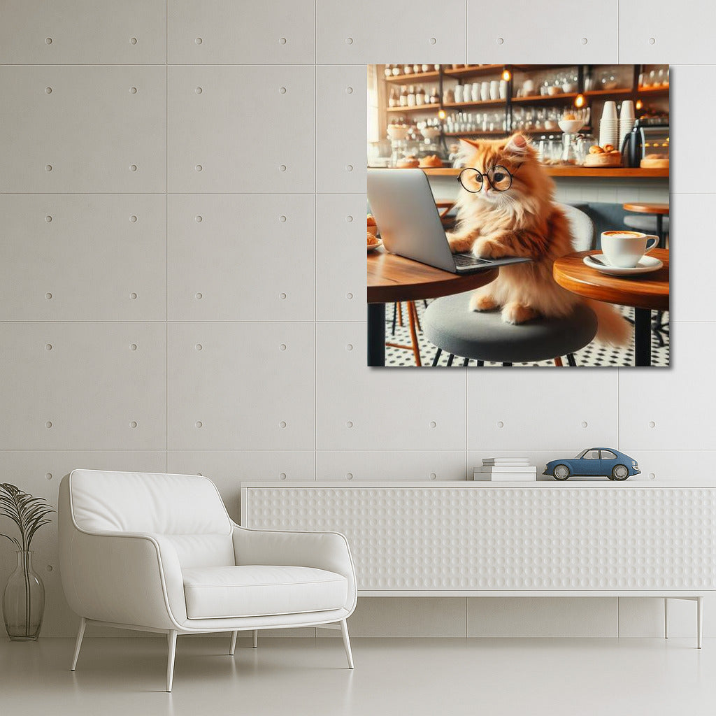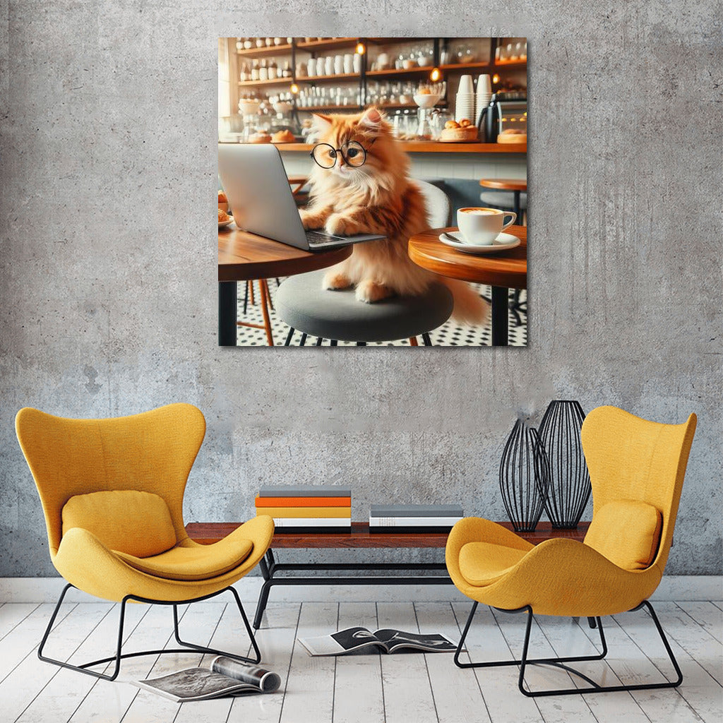 Cat in a Cafe: Fluffy IT Guy at His Laptop Wall Art
