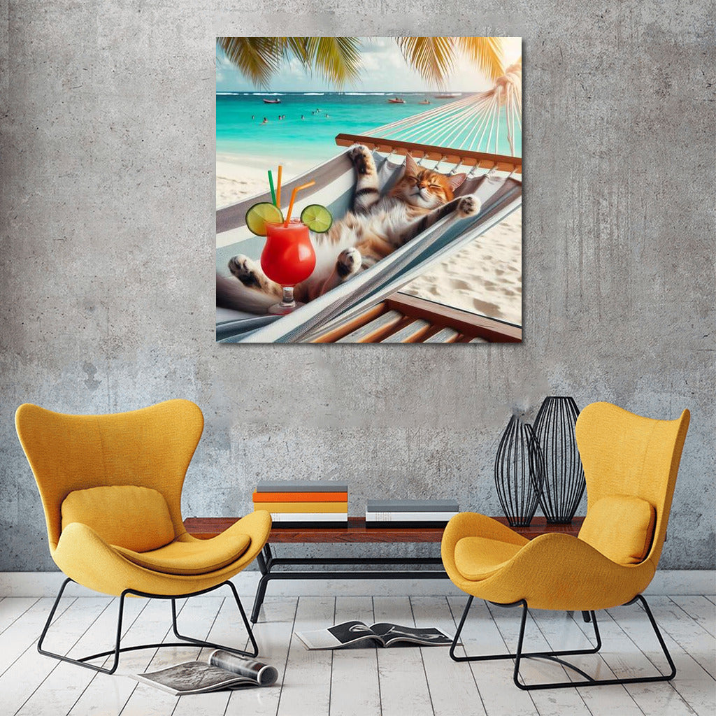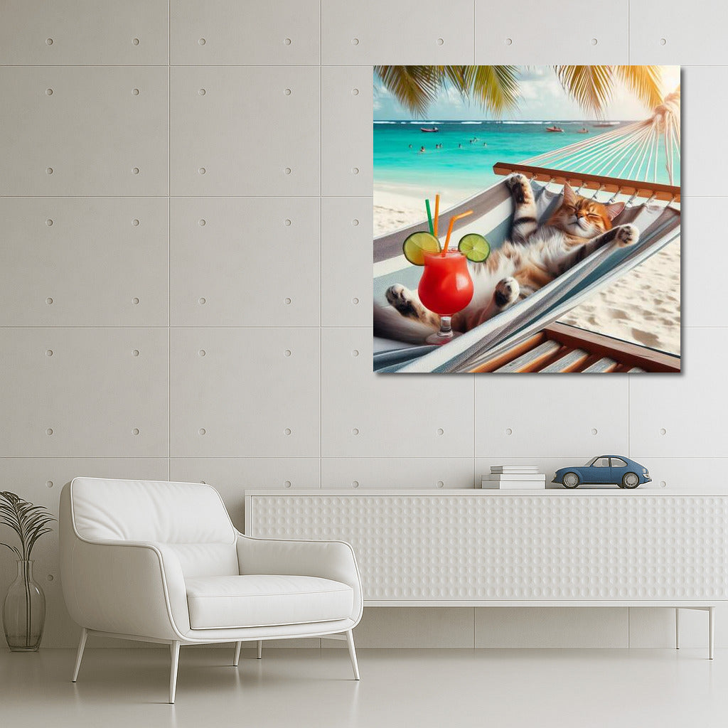 Cat in a Hammock: Beach Relaxation with a Cocktail Wall Art