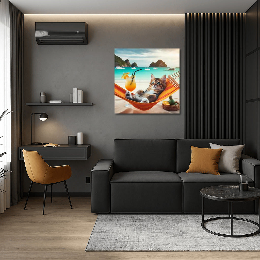 A cat enjoying a hammock on the beach while sipping a cocktail. A perfect poster for adding some lightness and relaxation to your space! See more from the collection: Animals Art