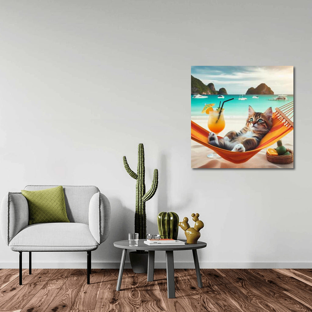 Cat in Paradise: Relaxing in a Hammock with a Cocktail on the Beach Wall Art