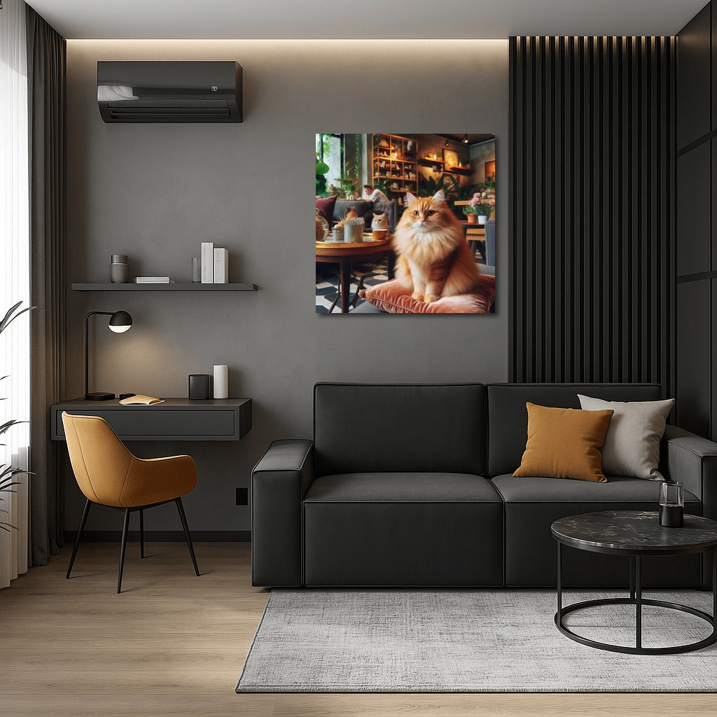 Cat in Stylish Cafe: Fluffy Grace and Comfort Wall Art