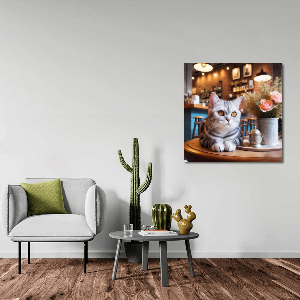 A charming cat in a cozy cafe is a poster that will add warmth and coziness to any space. Wall art for the soul. See more from the collection: American Shorthair Cat Art