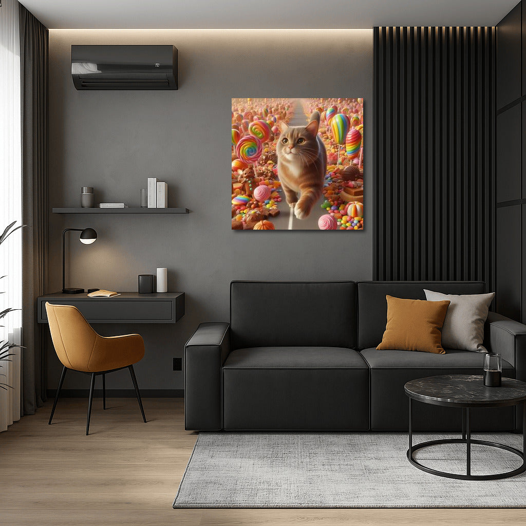 A fluffy cat is walking through a chocolate and candy world! Add some sweet magic with this vibrant wall art. See more from the collection: Animals Art