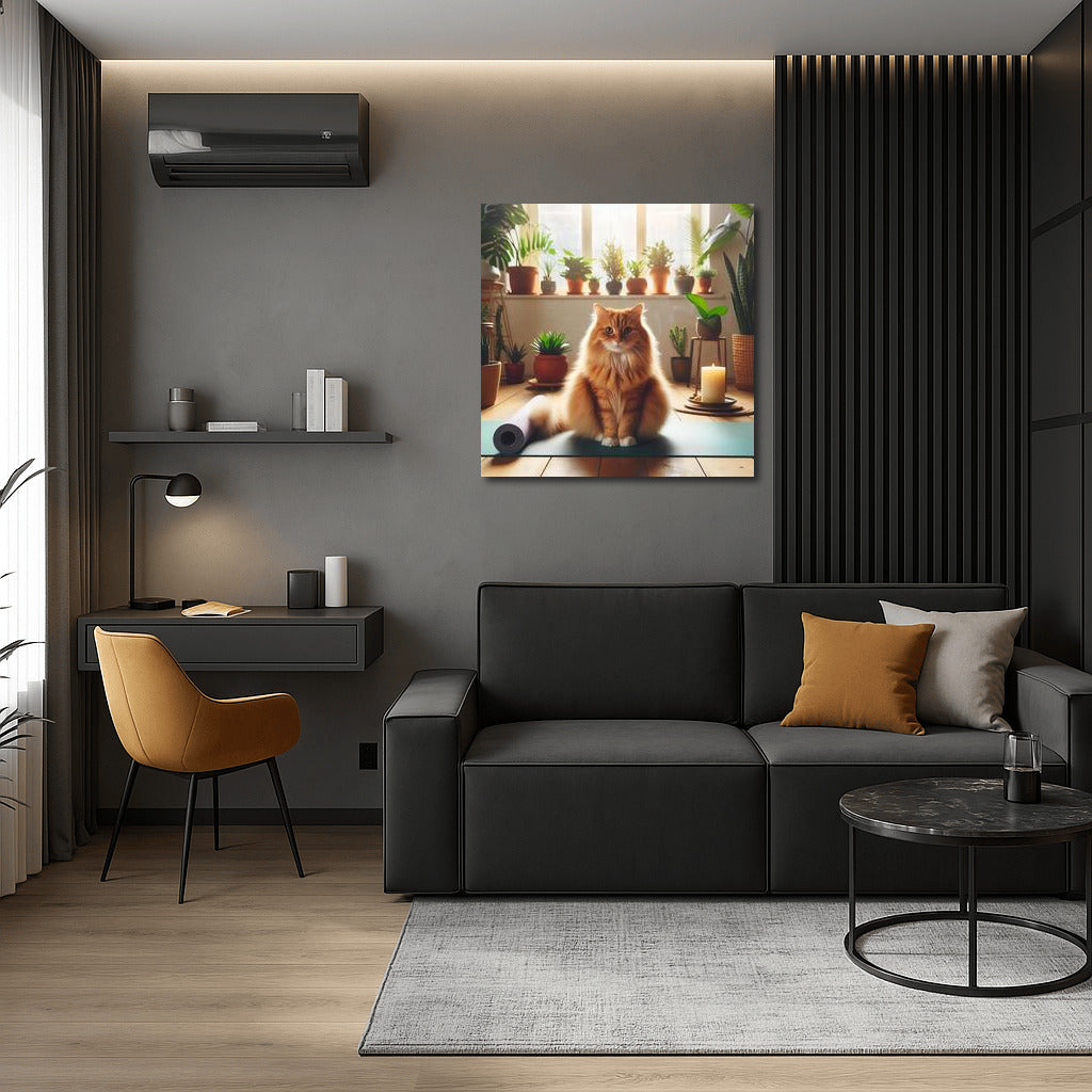 Create a cozy atmosphere with this painting of a cat in a yoga studio surrounded by greenery and tranquility. Perfect wall art for your home! See more from the collection: Animals Art