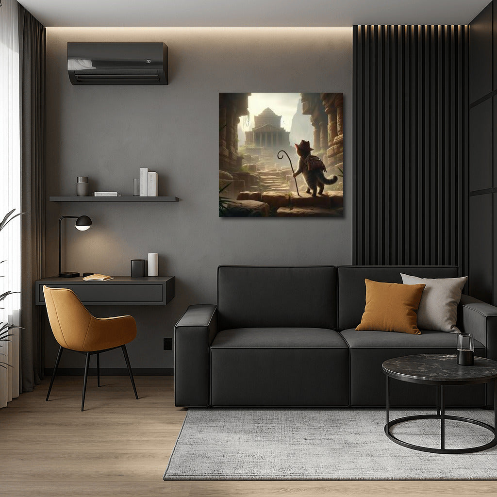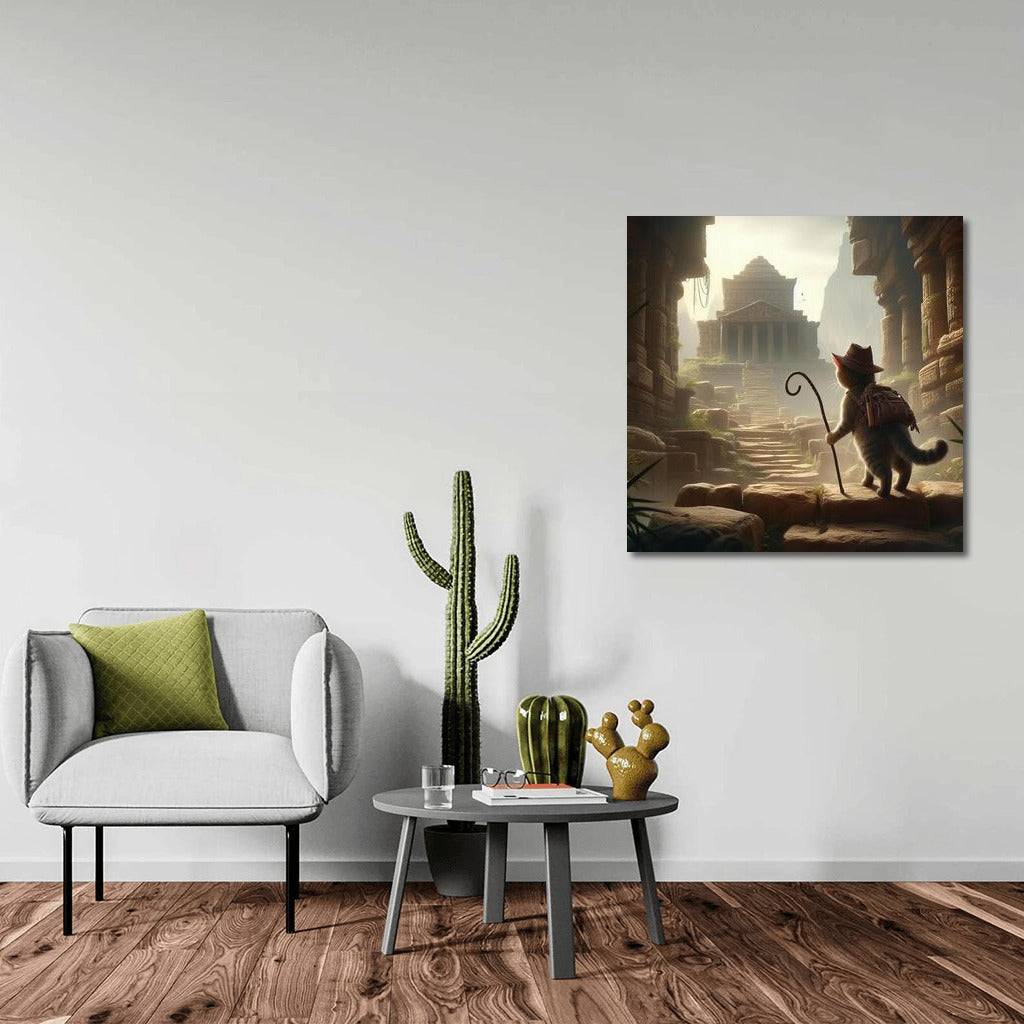 Indiana Jones style cat explores ancient ruins. Wall art full of adventure and mystery. See more from the collection: Animals Art