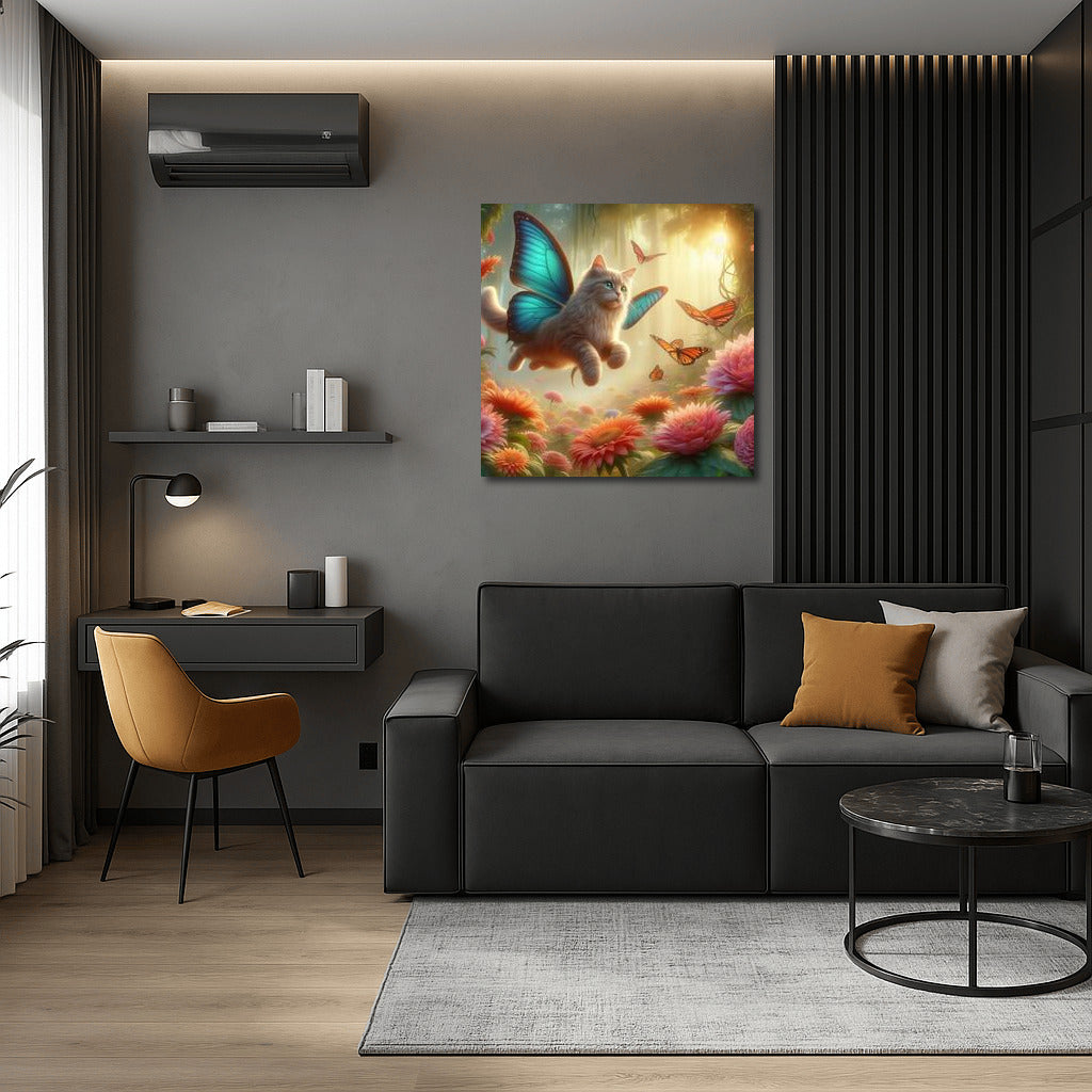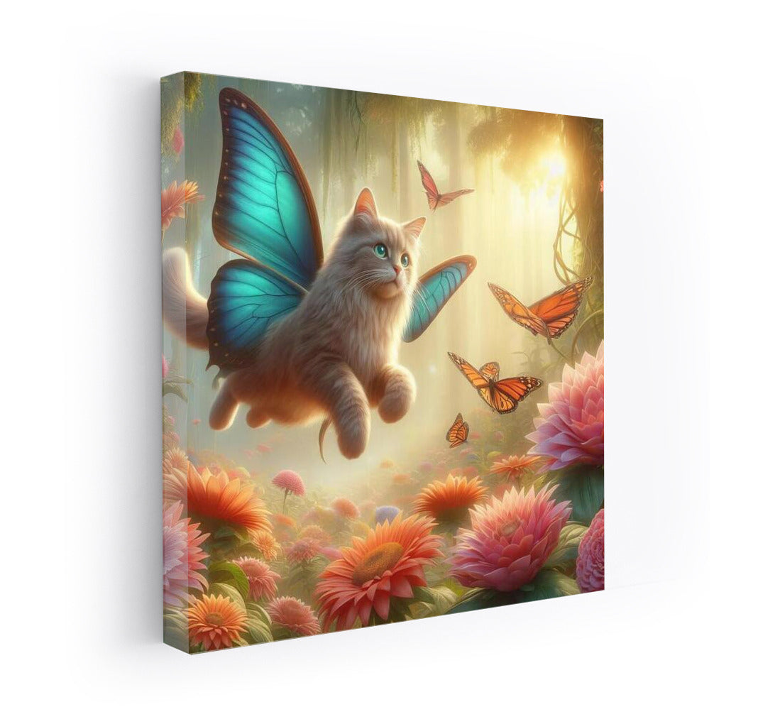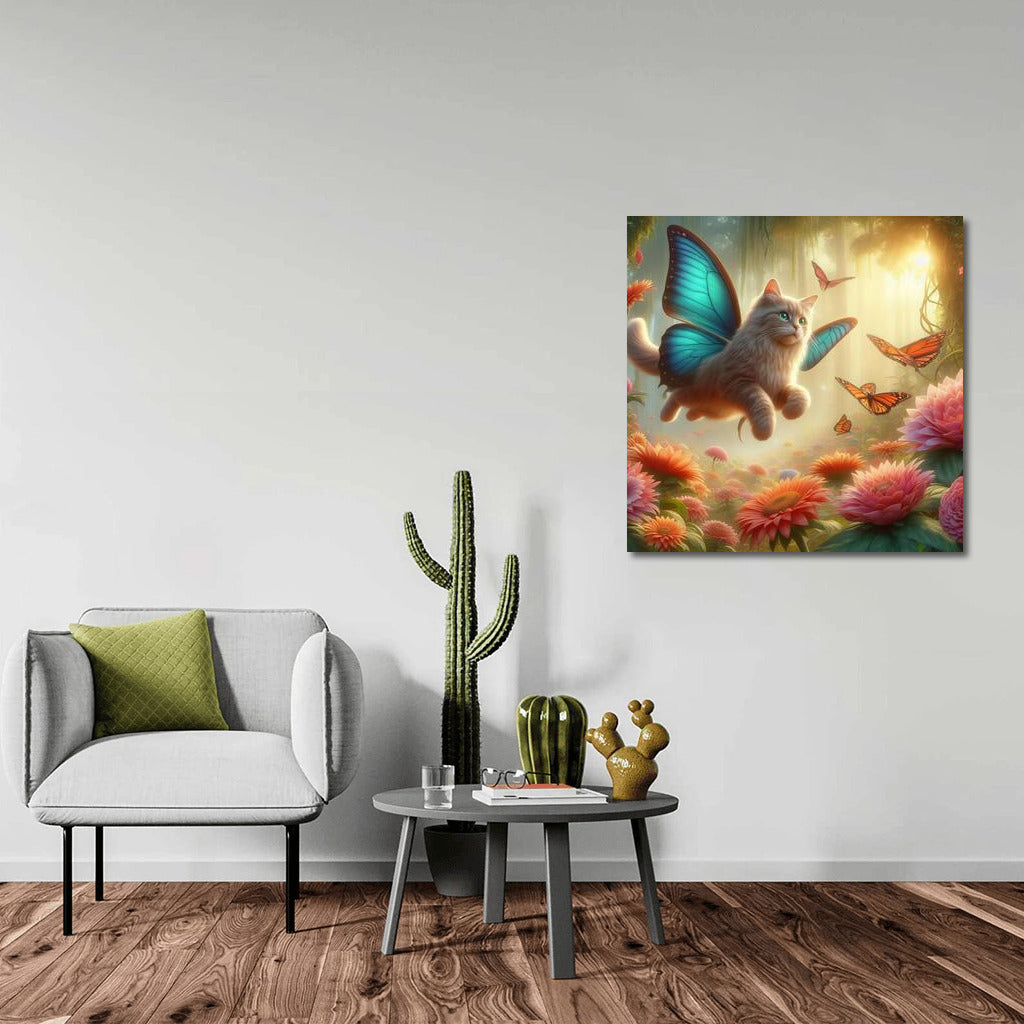 Cat on Butterfly Wings: Flight in the Magical Forest among Giant Flowers Wall Art