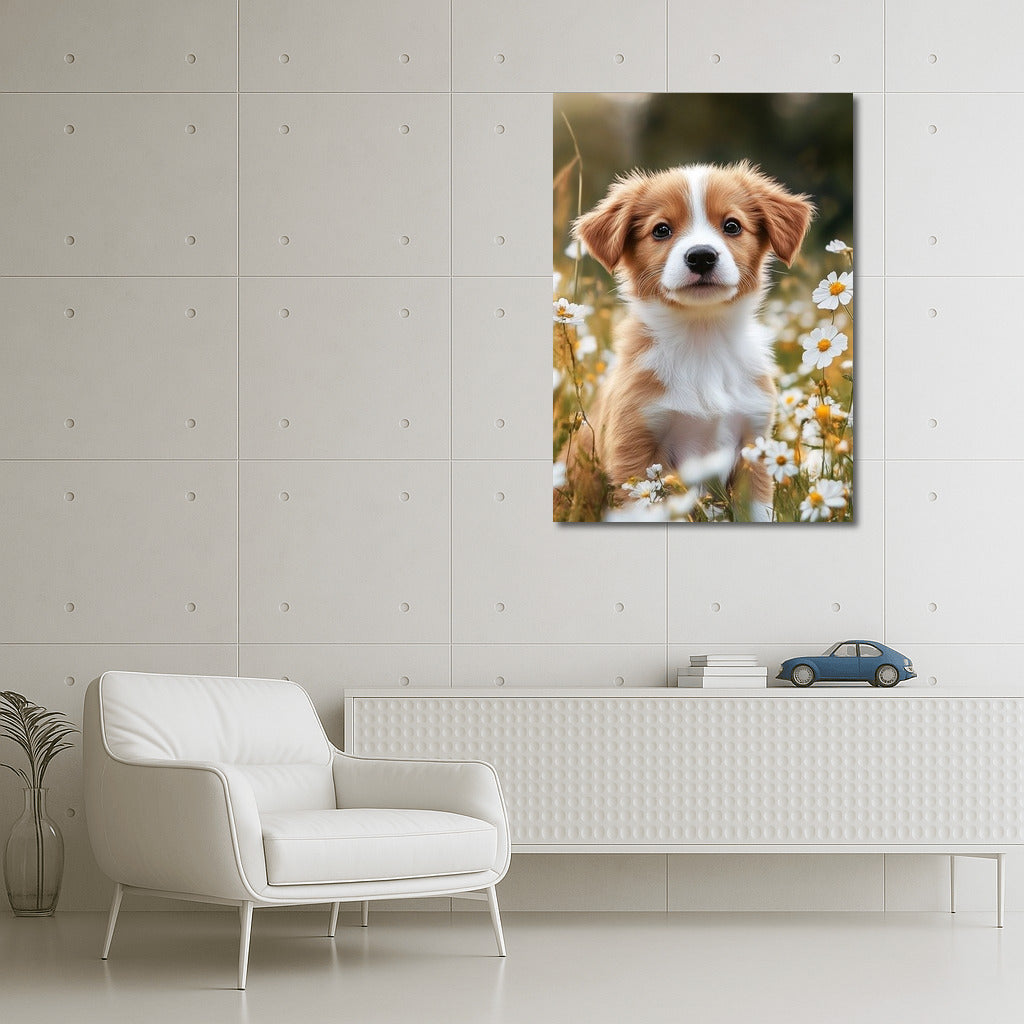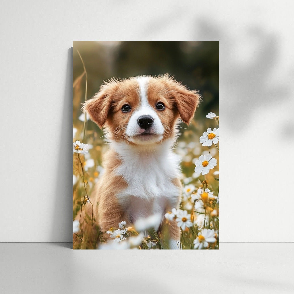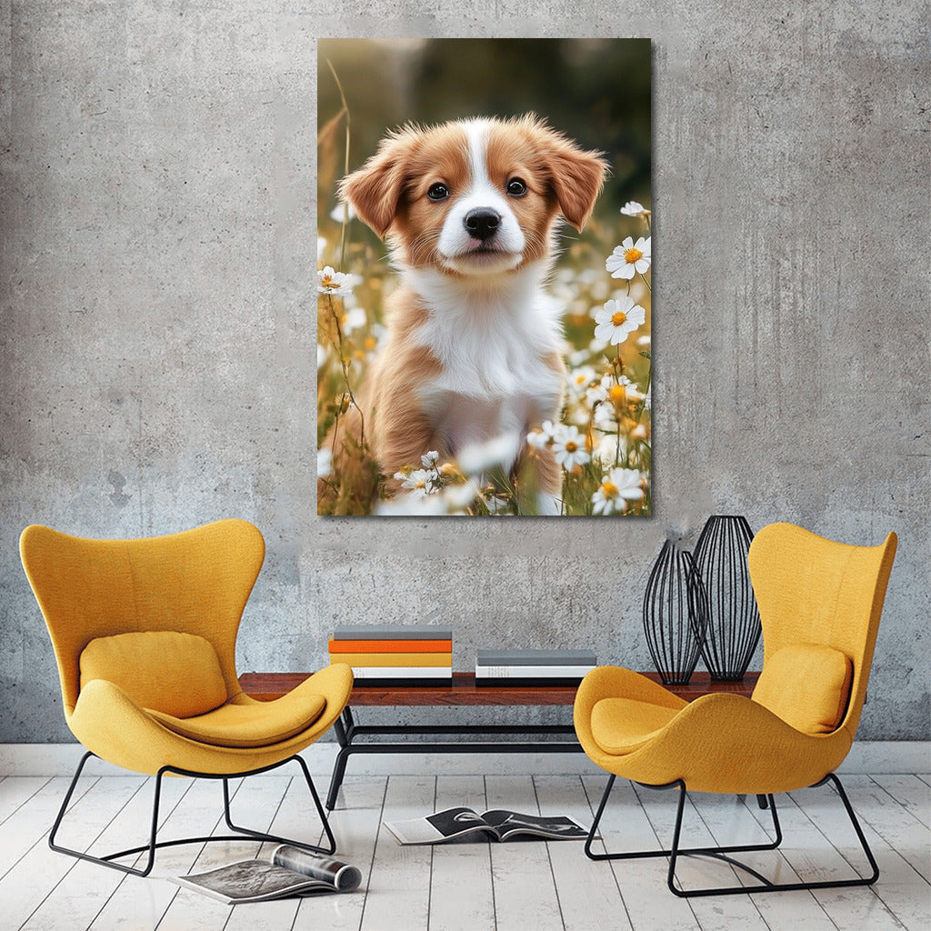 A charming puppy among daisies is a painting that will bring coziness to your home. An ideal poster for nature and animal lovers. See more from the collection: Animals Art