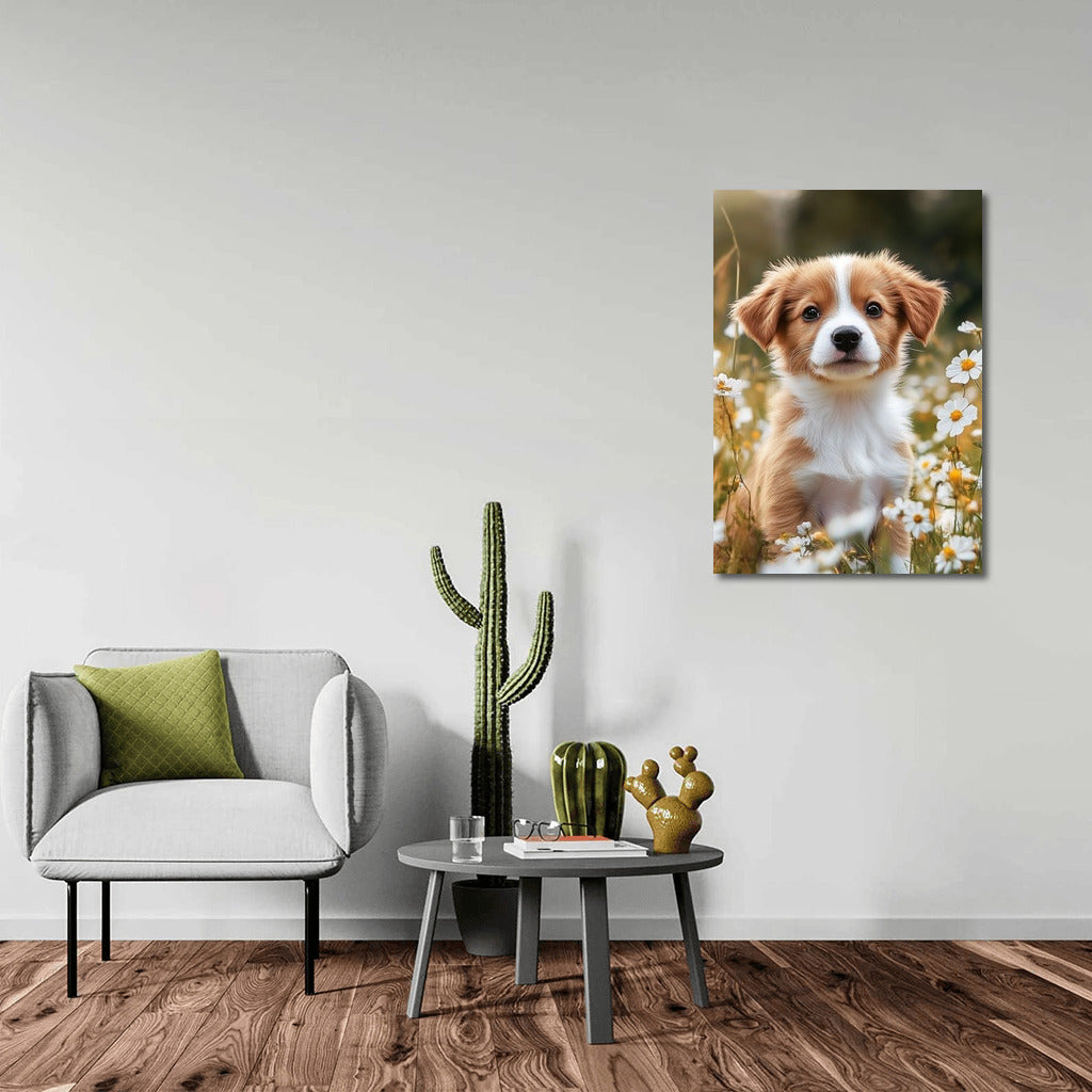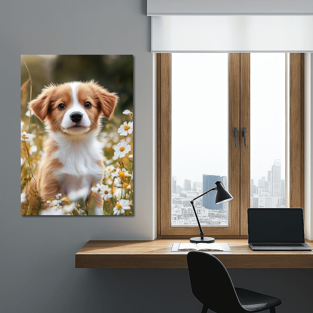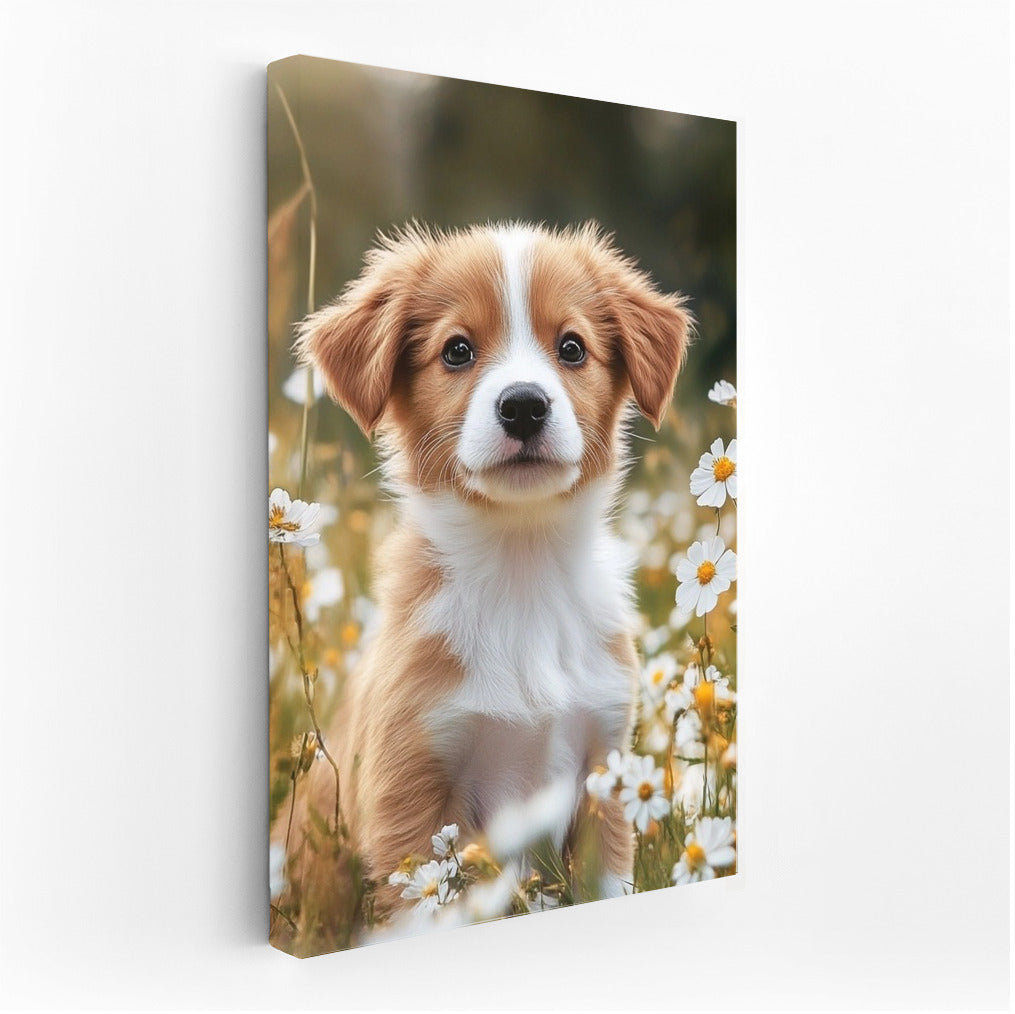 A charming puppy among daisies is a painting that will bring coziness to your home. An ideal poster for nature and animal lovers. See more from the collection: Animals Art