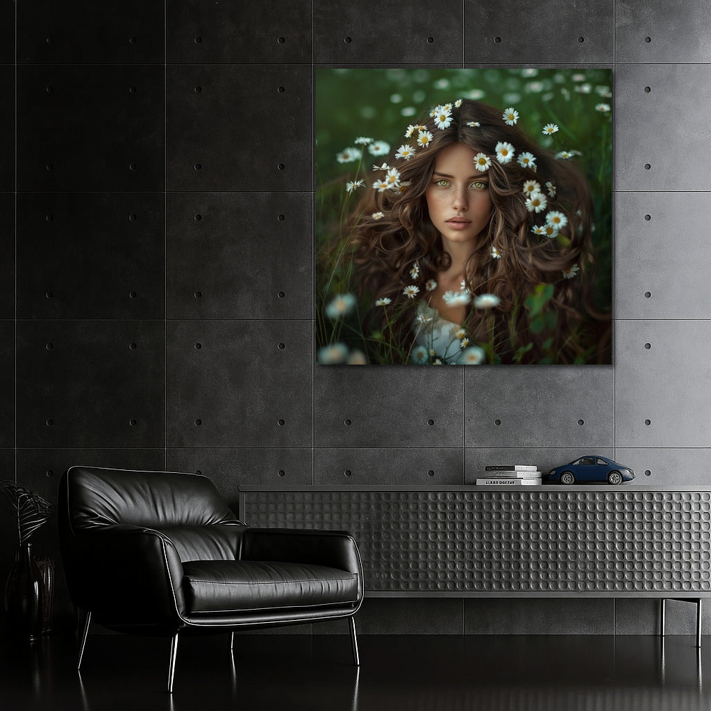 Drown in greenery and snow-white daisies. This poster with a girl will create an atmosphere of harmony and dreams in your space. See more from the collection: Wall Art with Women