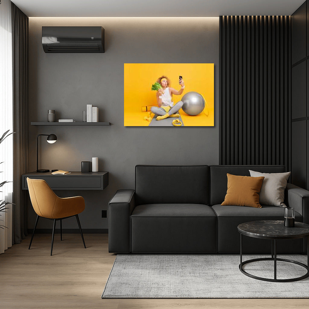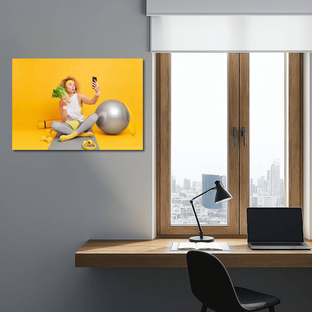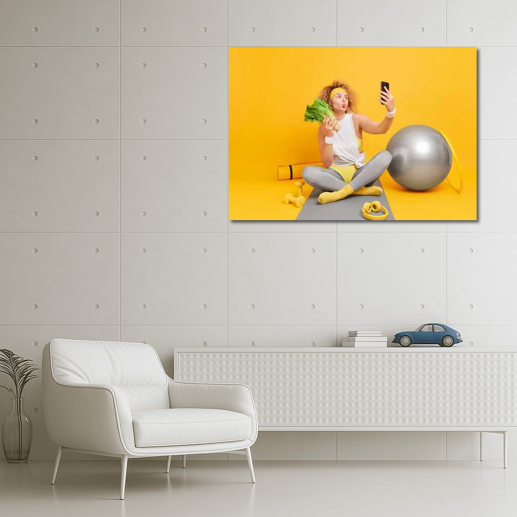 Vibrant wall art that inspires a healthy lifestyle. A cheerful person and fresh vegetables are the perfect motivation! See more from the collection: Healthy lifestyle Art
