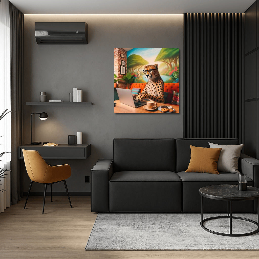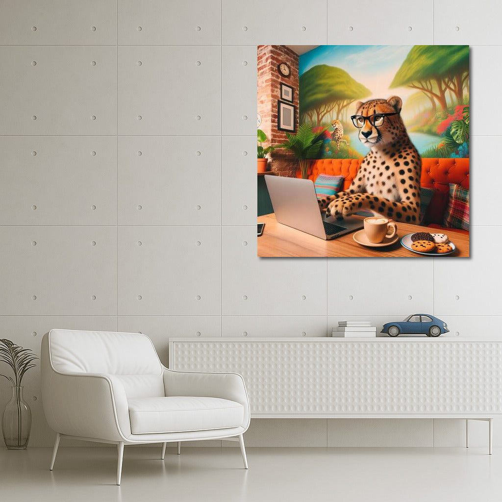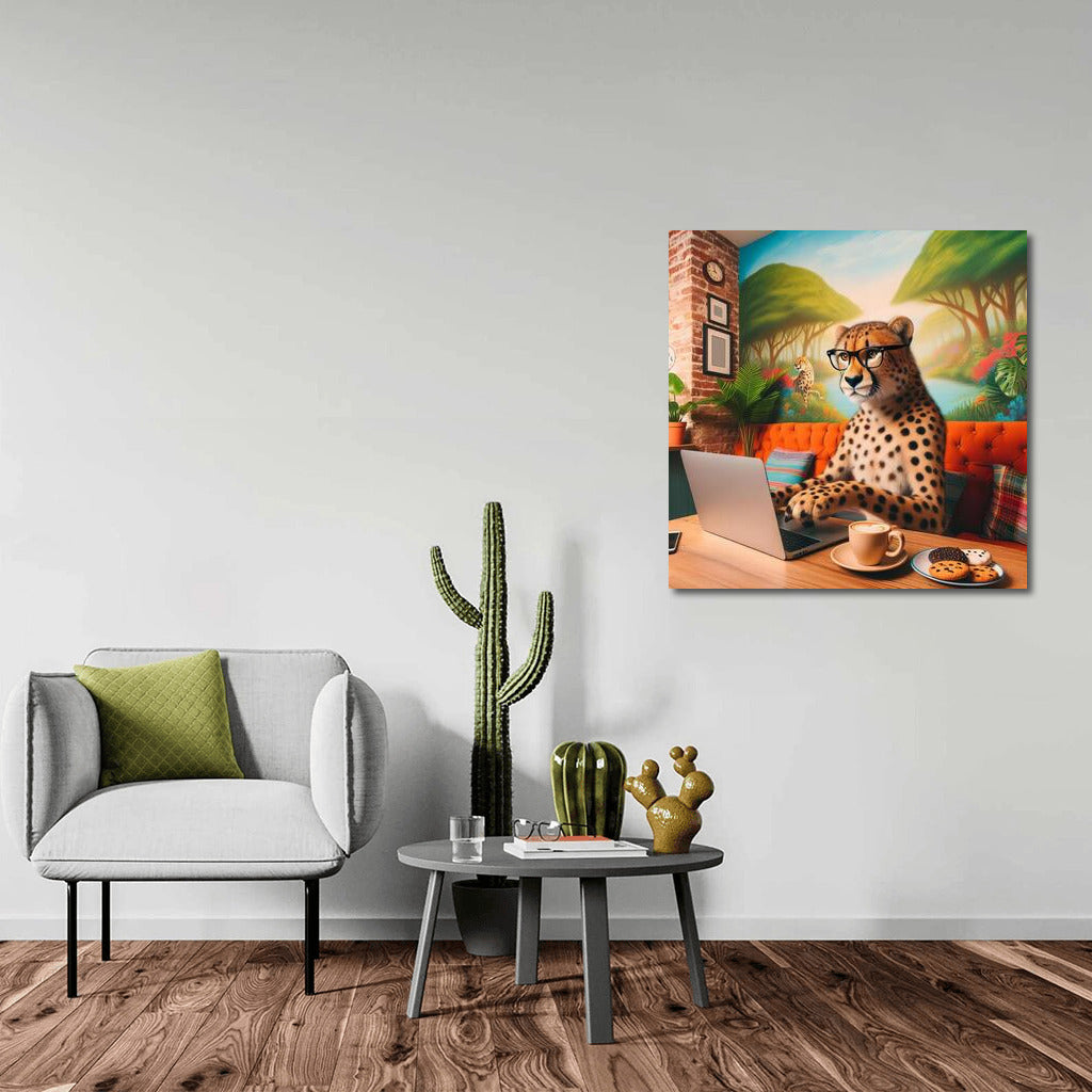Cheetah in Glasses at a Laptop: Cafe Adventure Wall Art