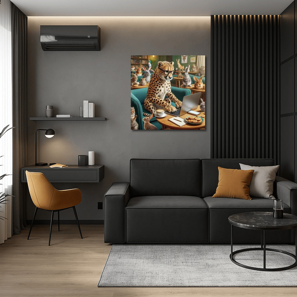 Creative wall art: a cheetah in glasses at a laptop in a cafe, surrounded by hares. A unique poster for your interior! See more from the collection: Animals Art