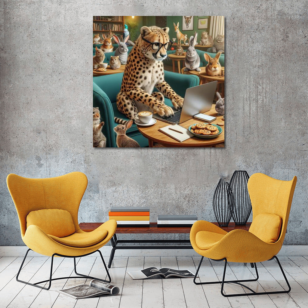 Cheetah in Glasses with Laptop in Cafe: Unique Decor with Hares Wall Art