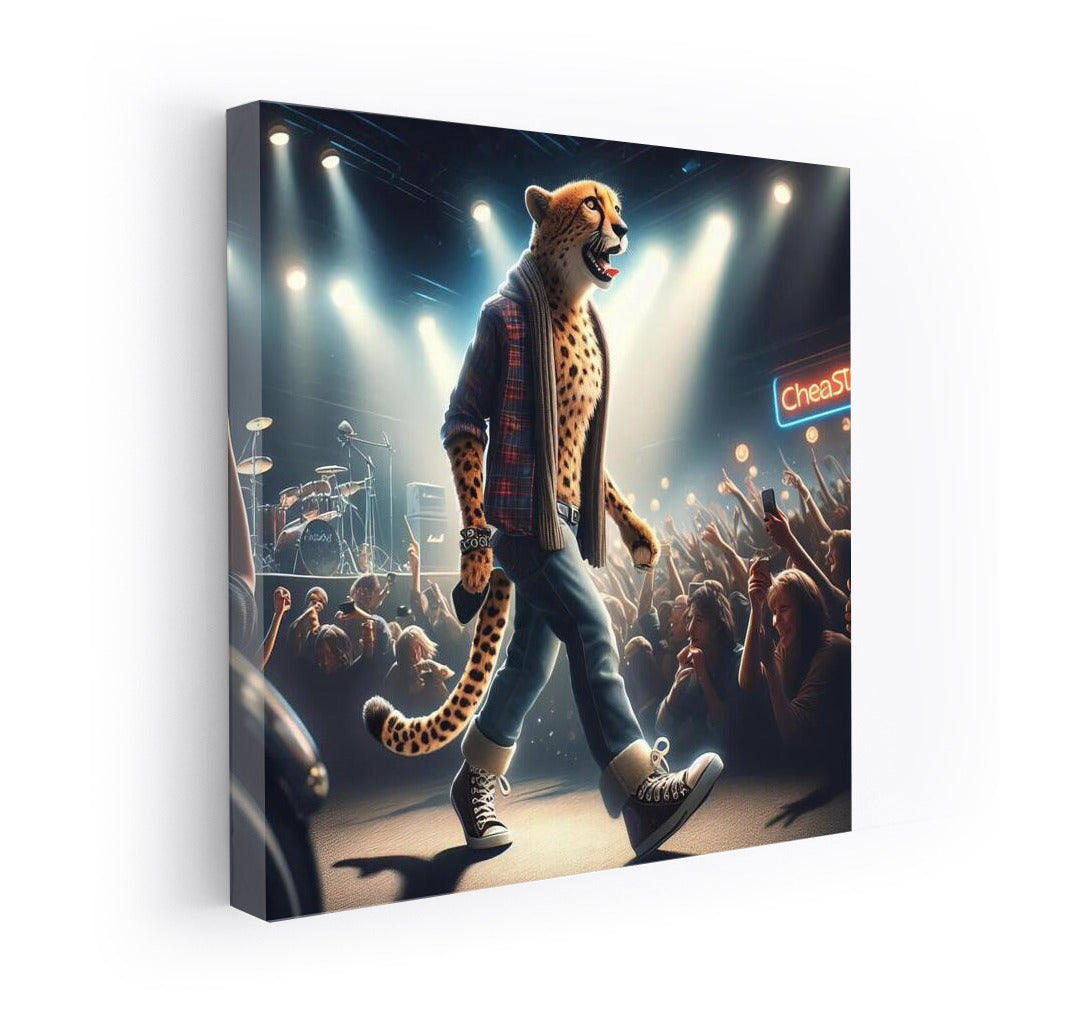 A cheetah in sneakers goes to a concert in a club. Add dynamics to your interior with this bright wall art poster! See more from the collection: Animals Art