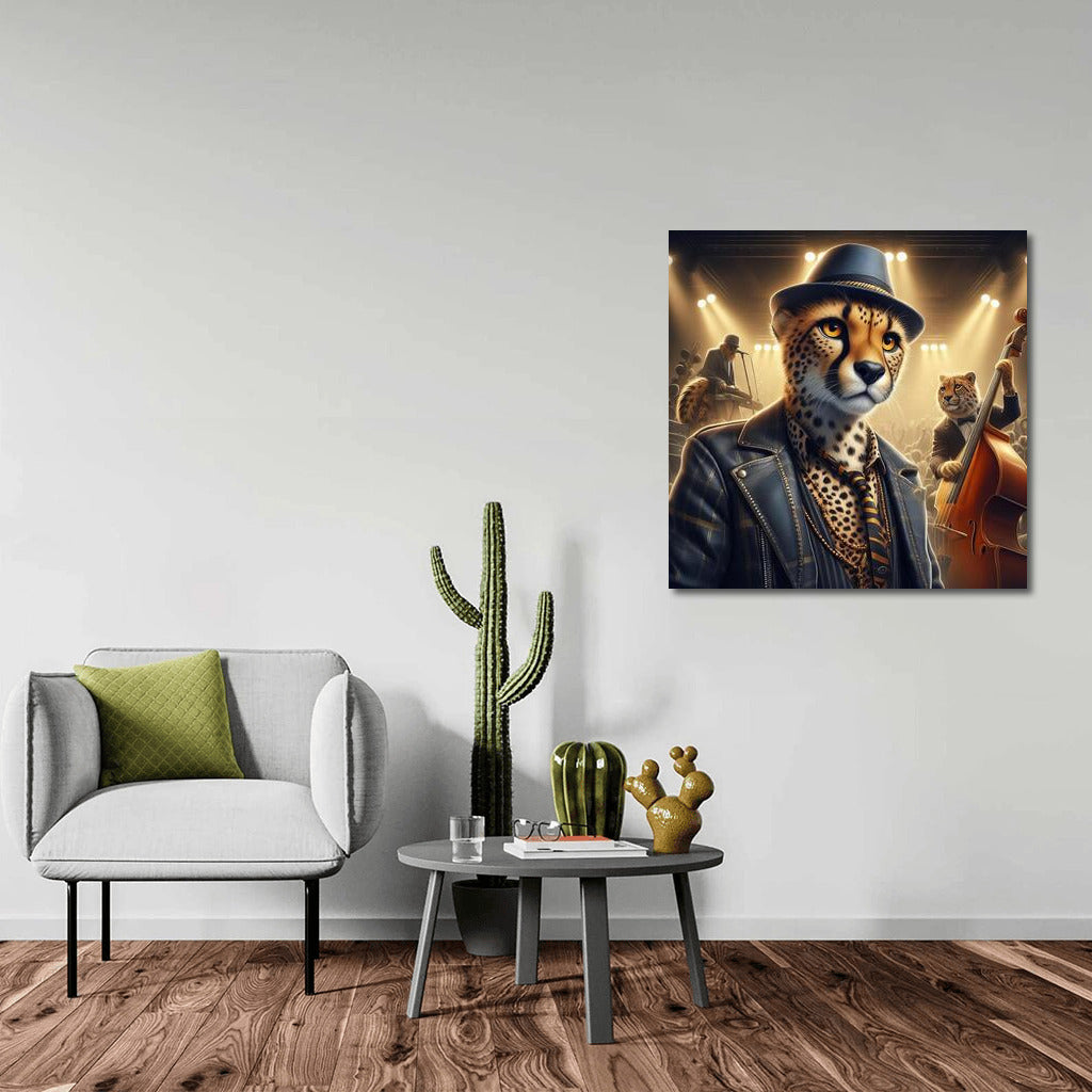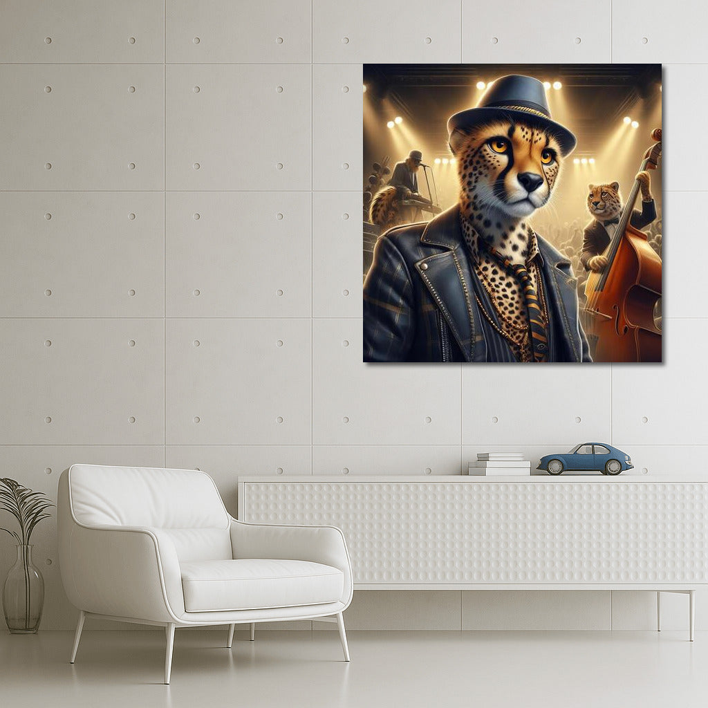 Stylish cheetah at a concert in a club. Unique painting enlivens your space! Wall art with character. See more from the collection: Animals Art