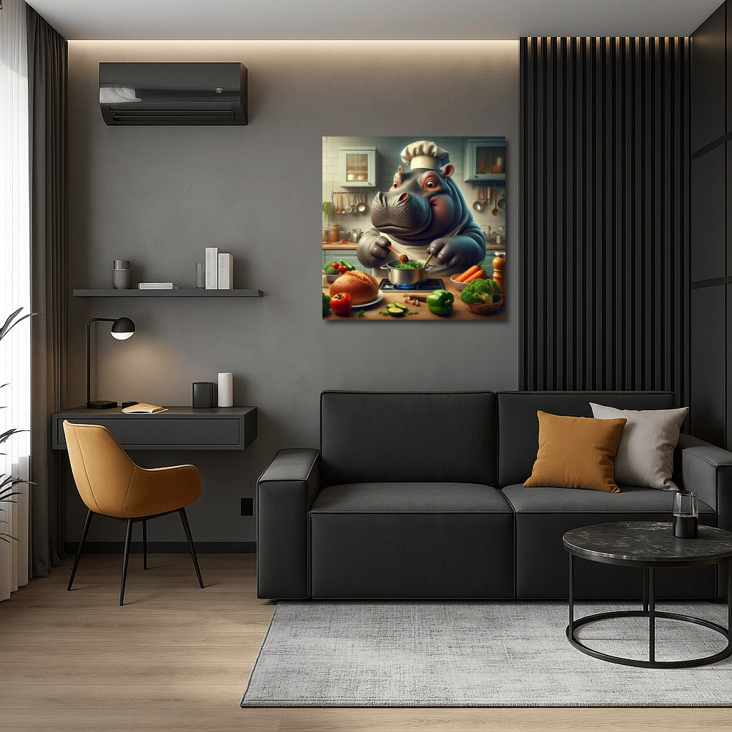 A fun poster of a hippo chef cooking dinner in the kitchen. Unique wall art for your interior! See more from the collection: Animals Art
