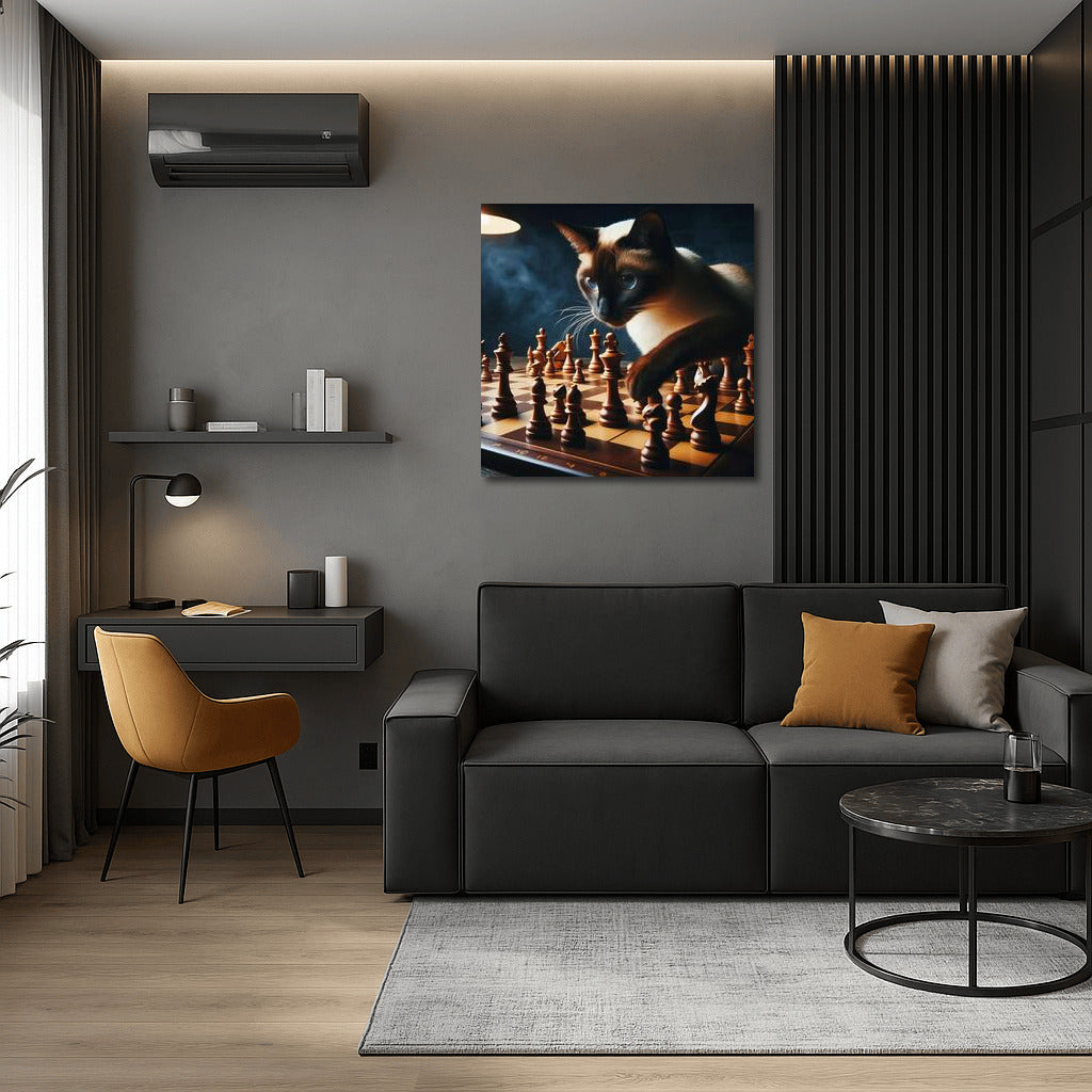 Siamese cat playing chess with living pieces. Unique wall art for fantasy and animal lovers. See more from the collection: Animals Art